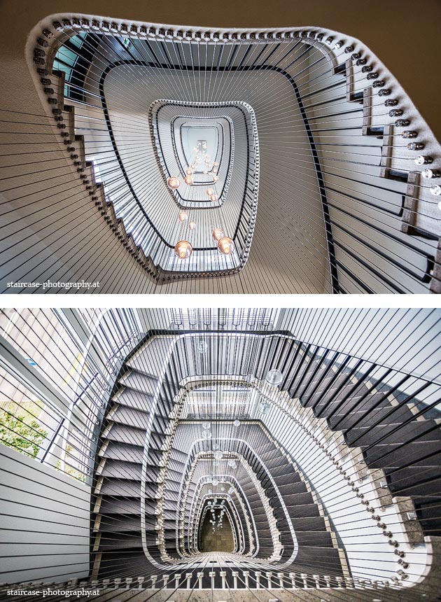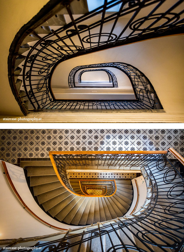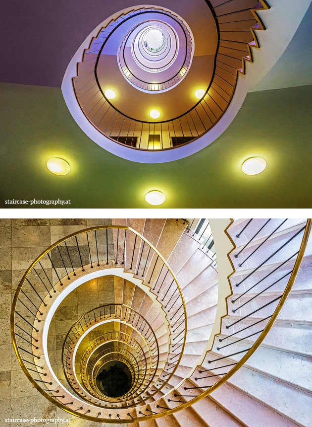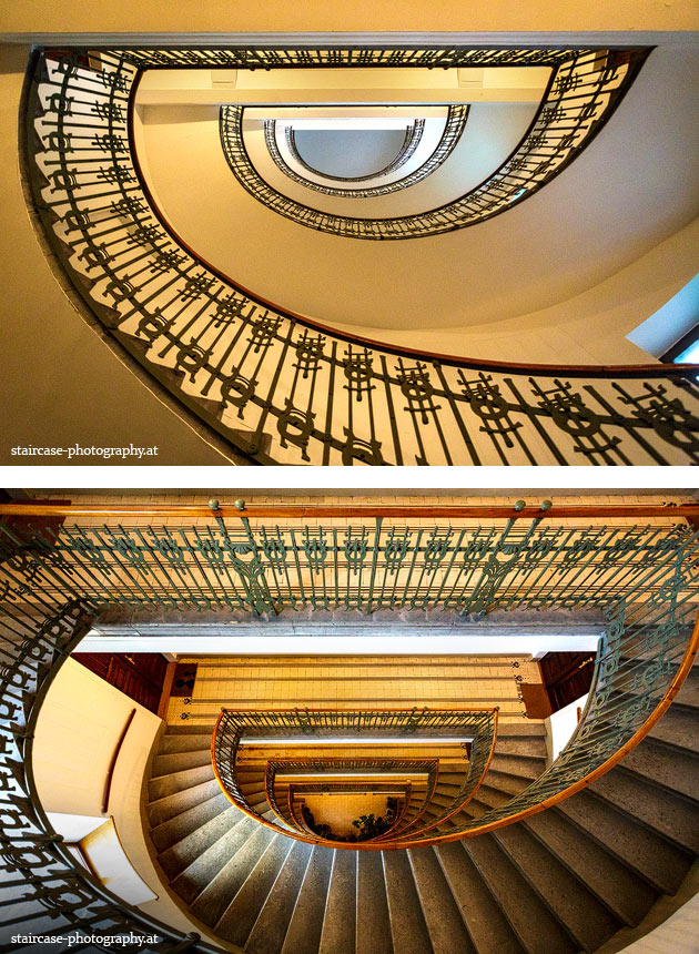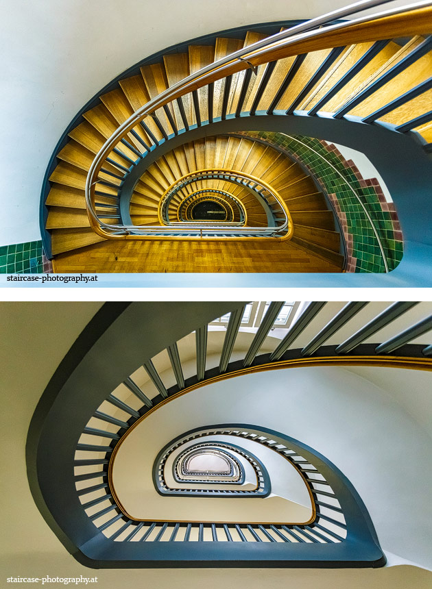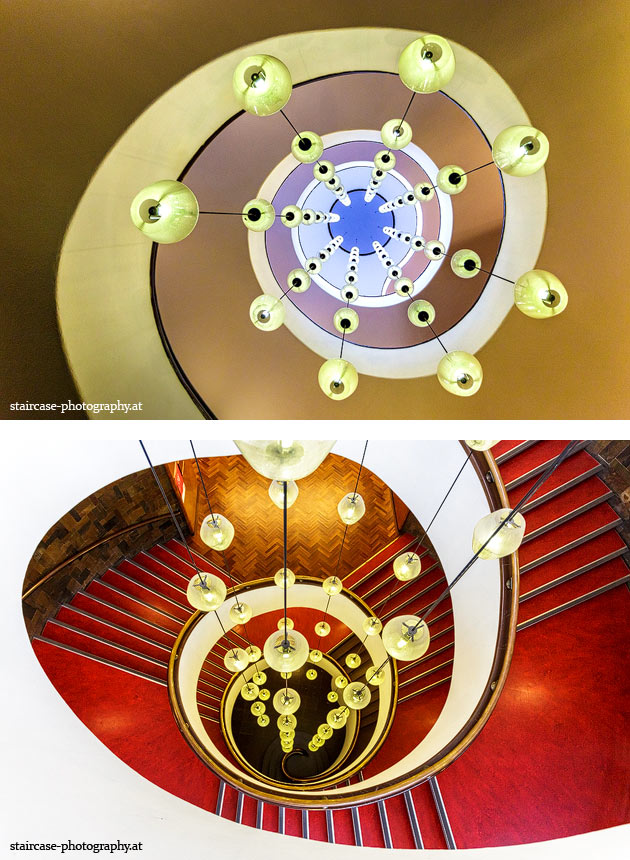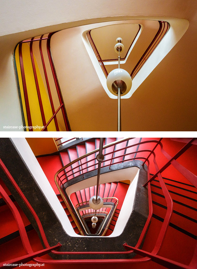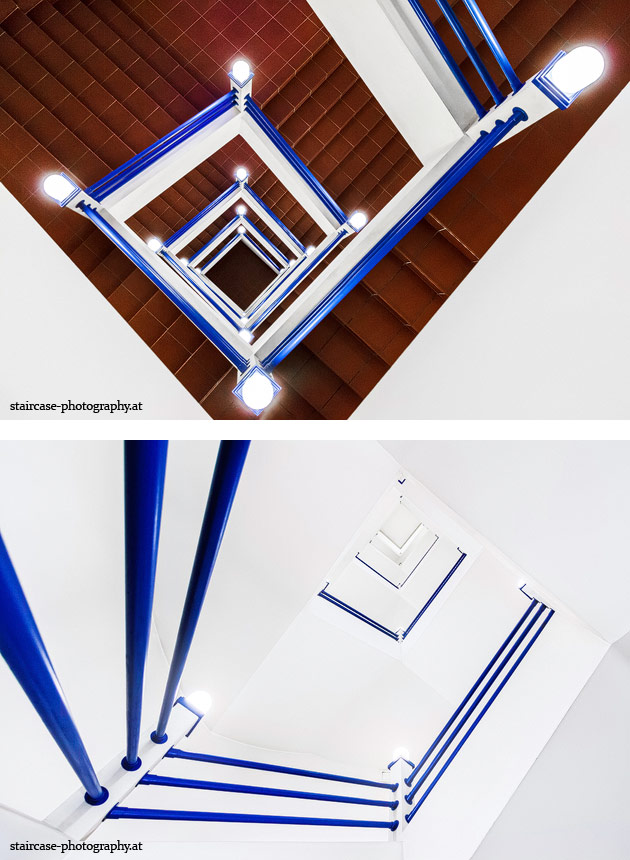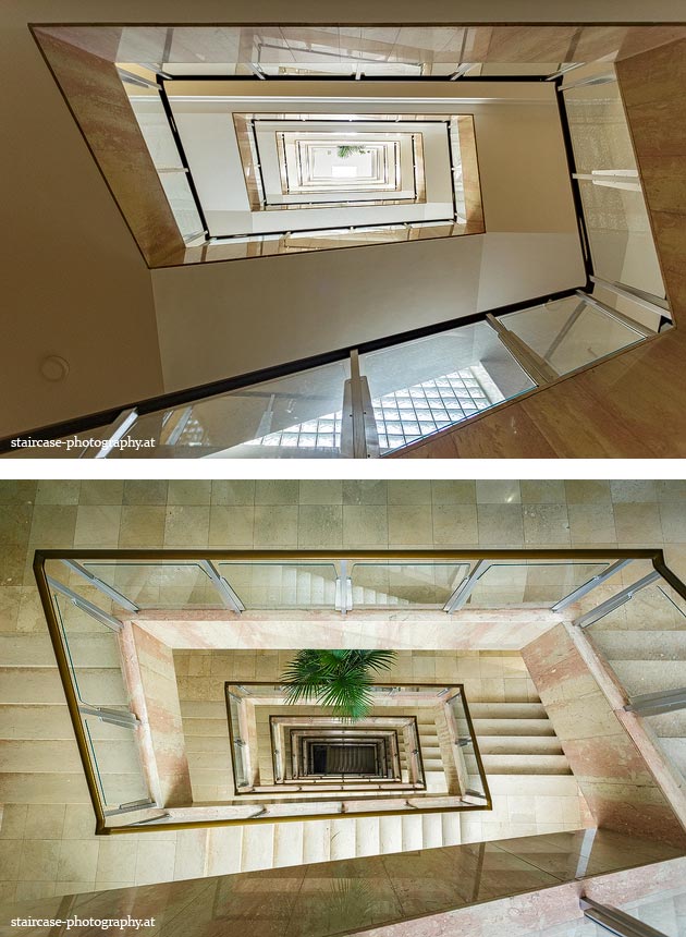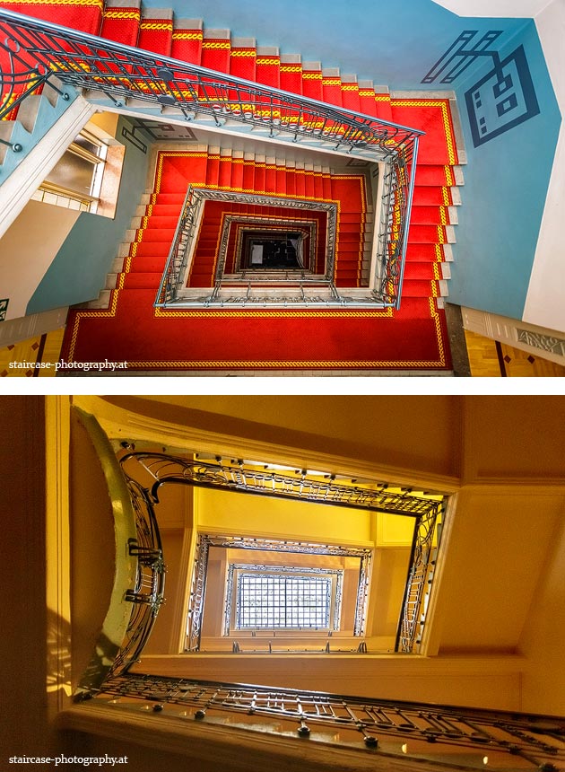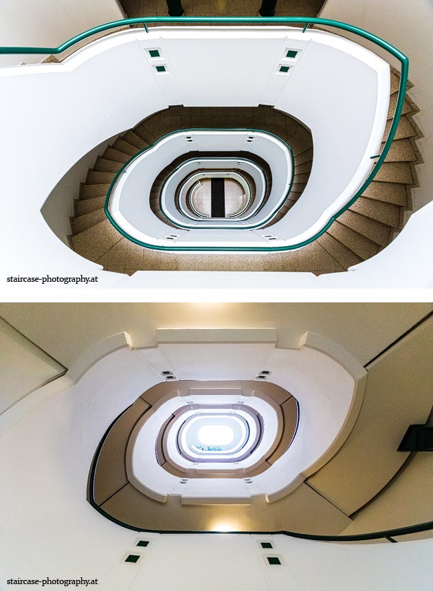 Der Blick von unten nach oben offenbart die Unterseite des Treppenlaufs, das Geländer und an der Spitze ein Deckenmuster. Beim Blick von oben nach unten dagegen bietet sich ein gänzlich anderes Bild, man sieht das Bodenmuster der Treppe, den gefärbten Handlauf und bemerkt eine gänzlich andere Lichtstimmung als zuvor. Einmal präsentiert sich ein und dasselbe Stiegenhaus im Vergleich der Blickwinkel vollkommen anders, ein anderes Mal erkennt man deutlich denselben Charakter von beiden Seiten aus.