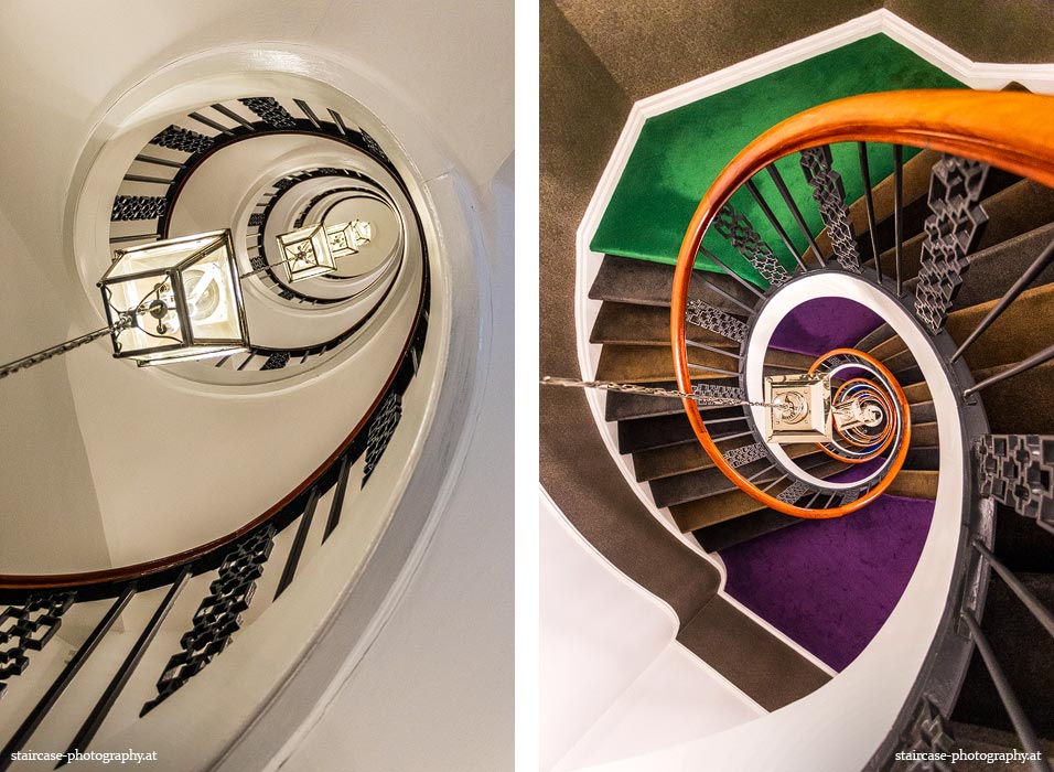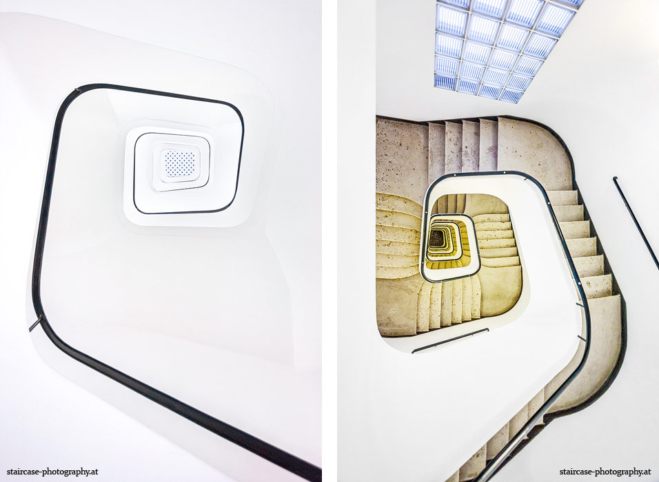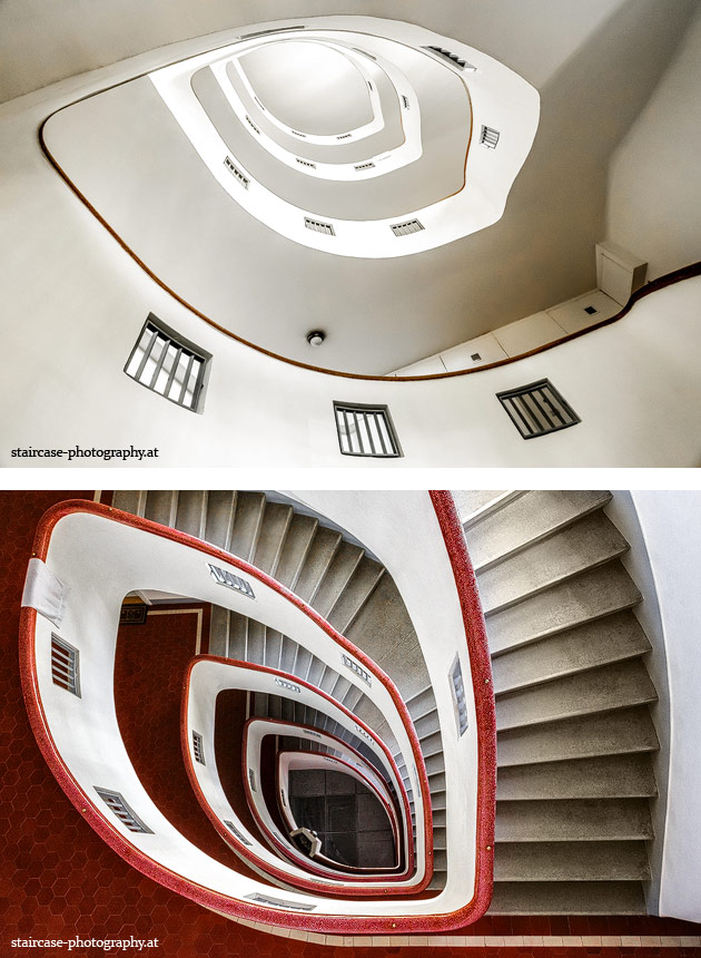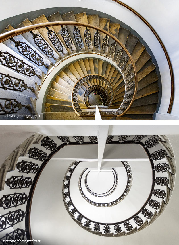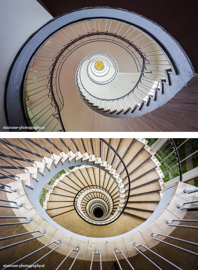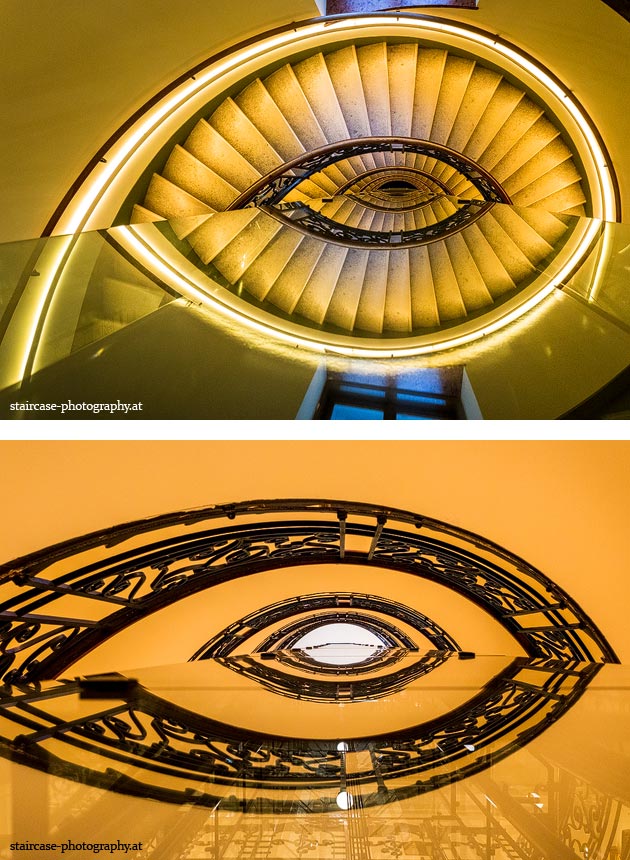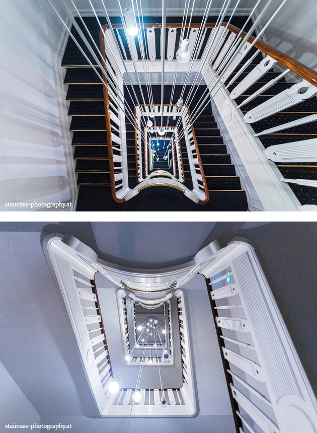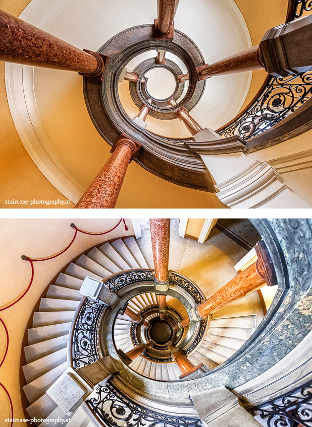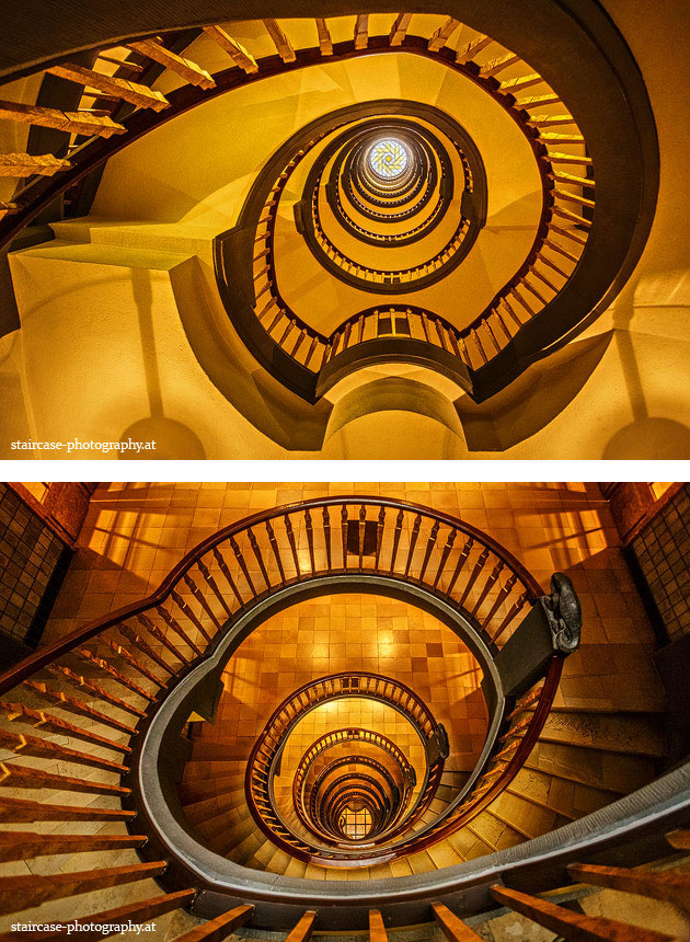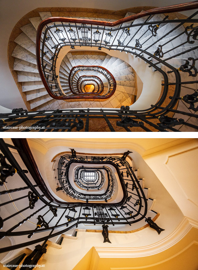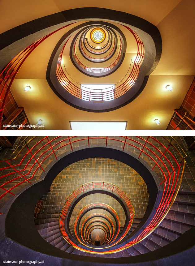 Der Blick von unten nach oben offenbart die Unterseite des Treppenlaufs, das Geländer und an der Spitze ein Deckenmuster. Beim Blick von oben nach unten dagegen bietet sich ein gänzlich anderes Bild, man sieht das Bodenmuster der Treppe, den gefärbten Handlauf und bemerkt eine gänzlich andere Lichtstimmung als zuvor. Einmal präsentiert sich ein und dasselbe Stiegenhaus im Vergleich der Blickwinkel vollkommen anders, ein anderes Mal erkennt man deutlich denselben Charakter von beiden Seiten aus.