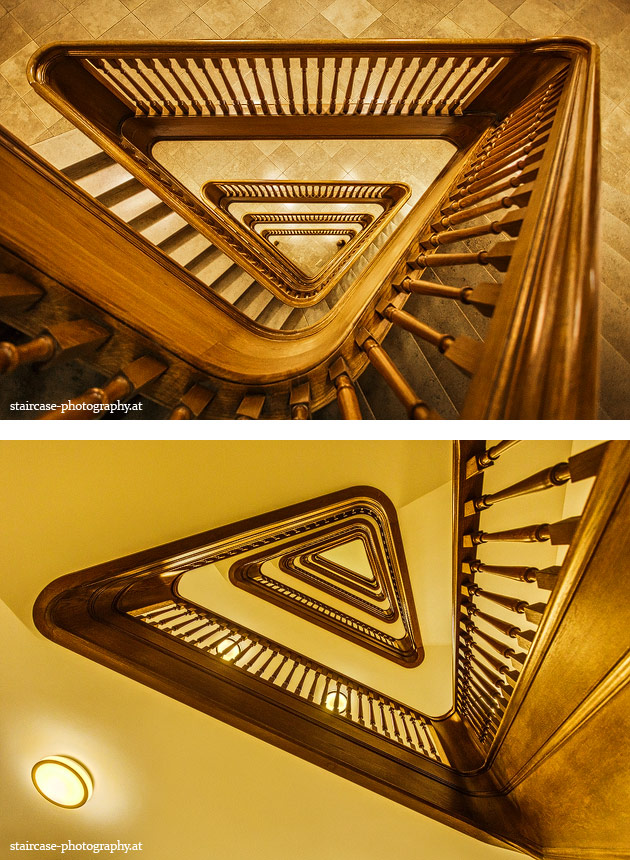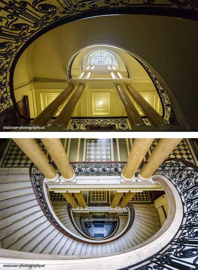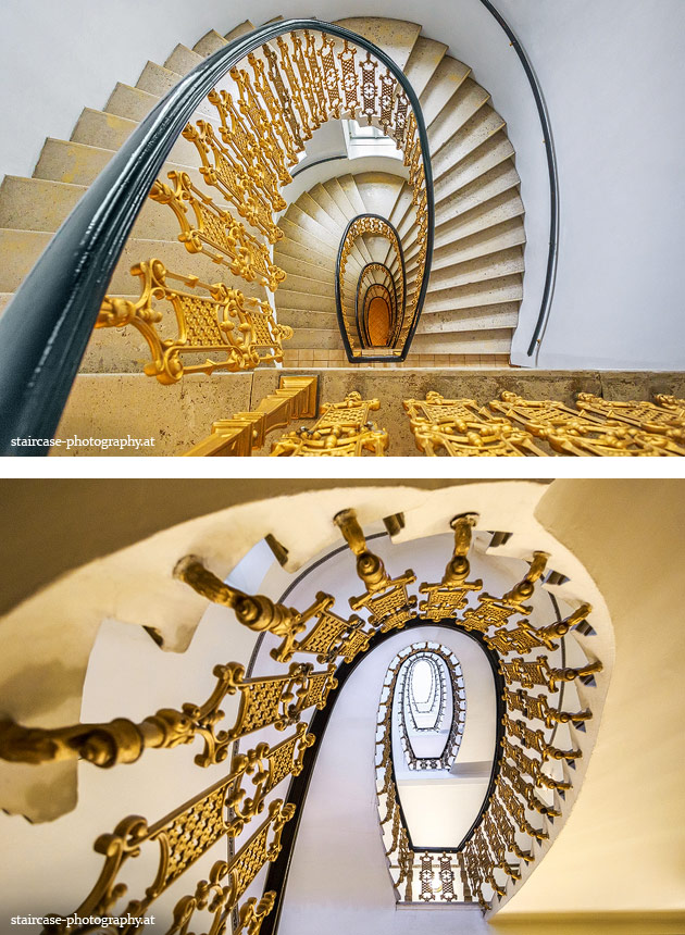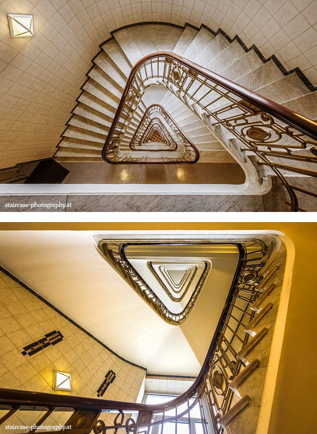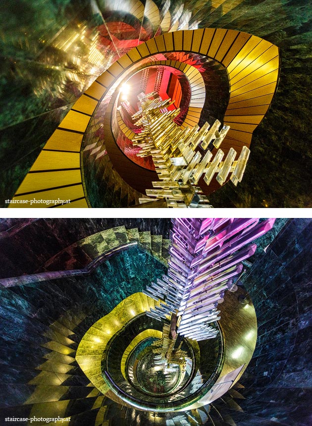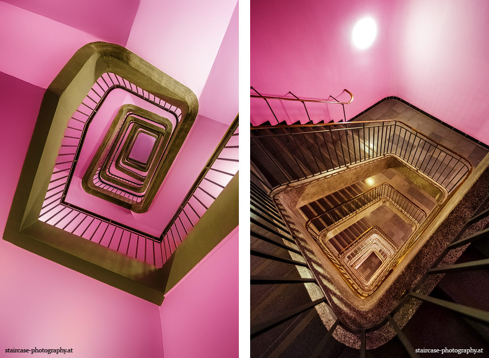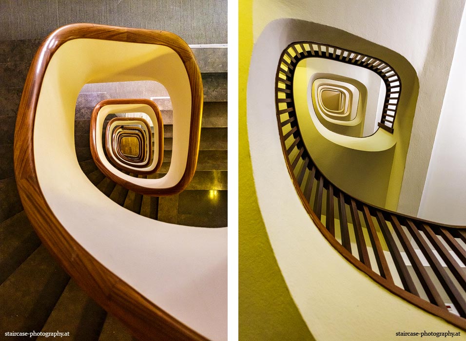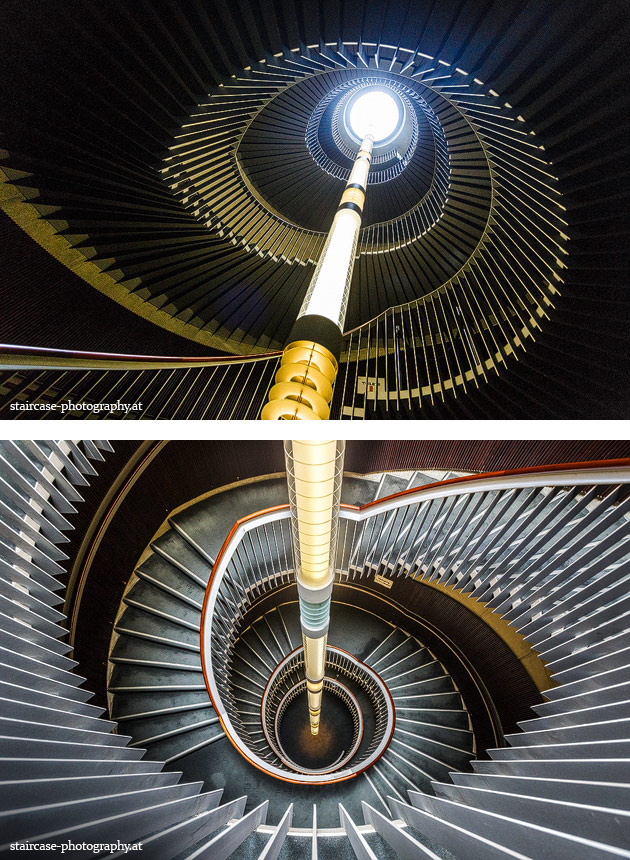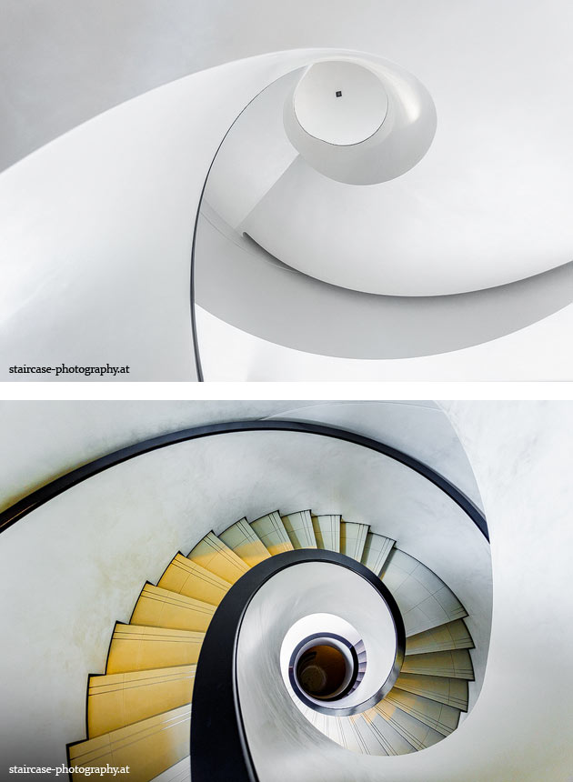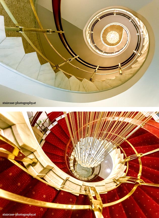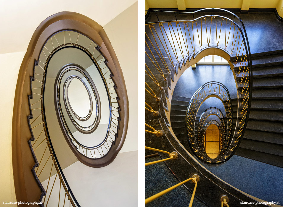 Der Blick von unten nach oben offenbart die Unterseite des Treppenlaufs, das Geländer und an der Spitze ein Deckenmuster. Beim Blick von oben nach unten dagegen bietet sich ein gänzlich anderes Bild, man sieht das Bodenmuster der Treppe, den gefärbten Handlauf und bemerkt eine gänzlich andere Lichtstimmung als zuvor. Einmal präsentiert sich ein und dasselbe Stiegenhaus im Vergleich der Blickwinkel vollkommen anders, ein anderes Mal erkennt man deutlich denselben Charakter von beiden Seiten aus.