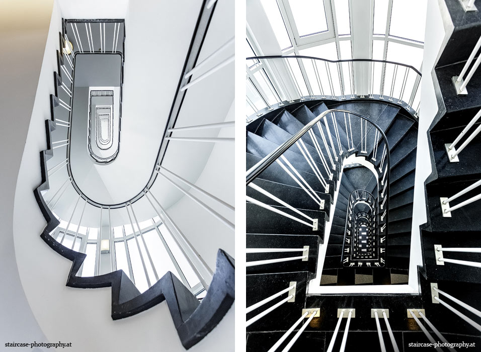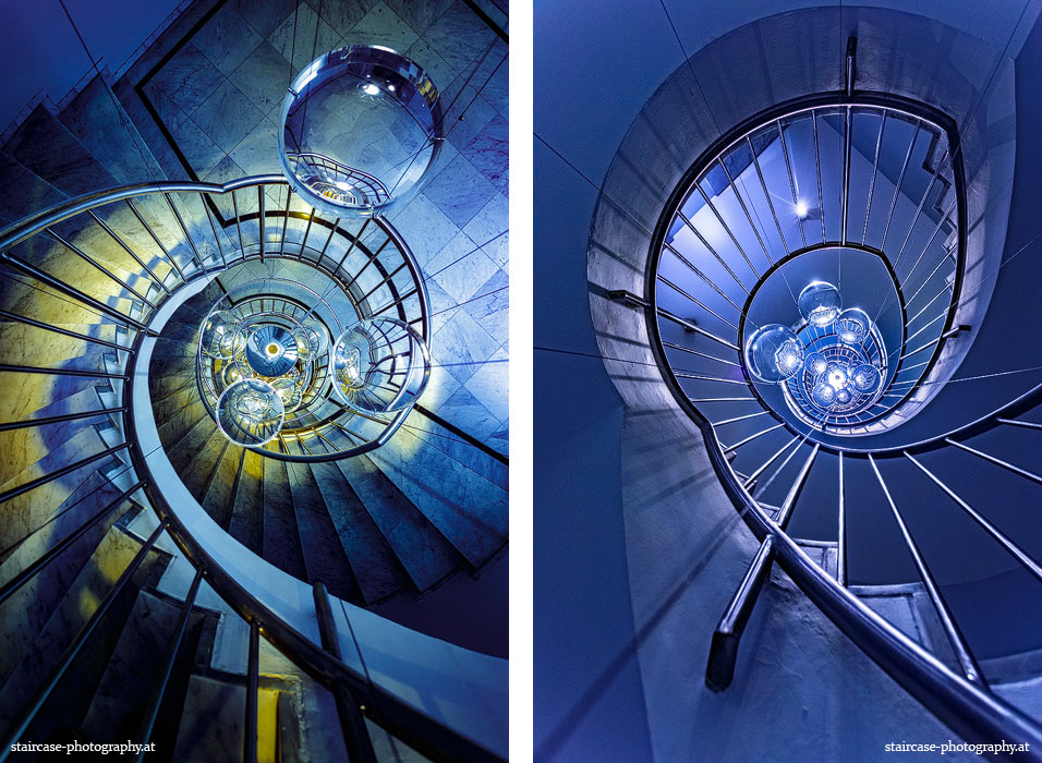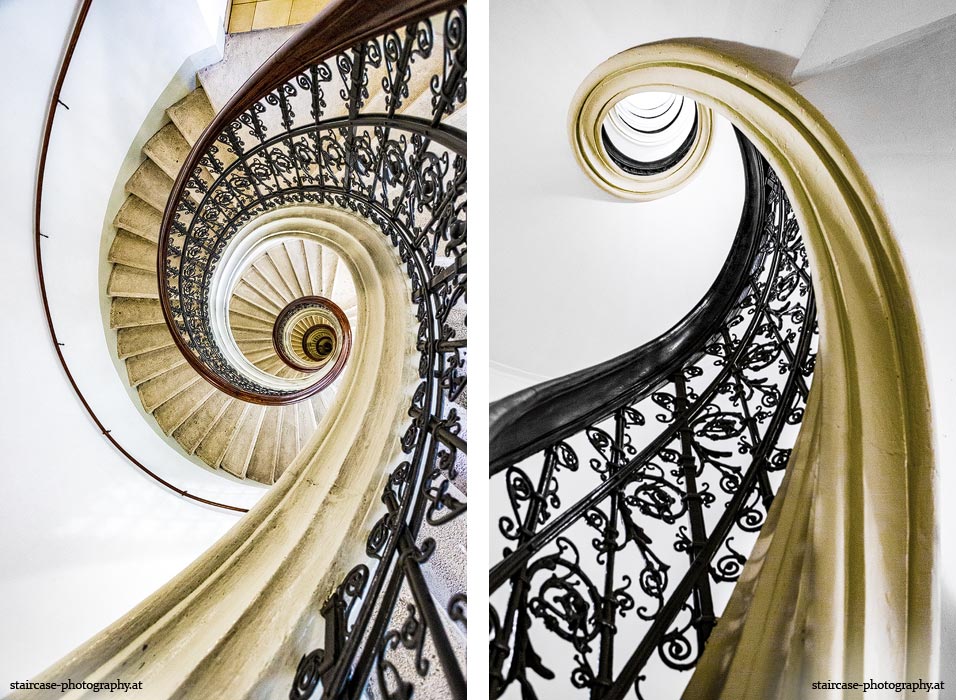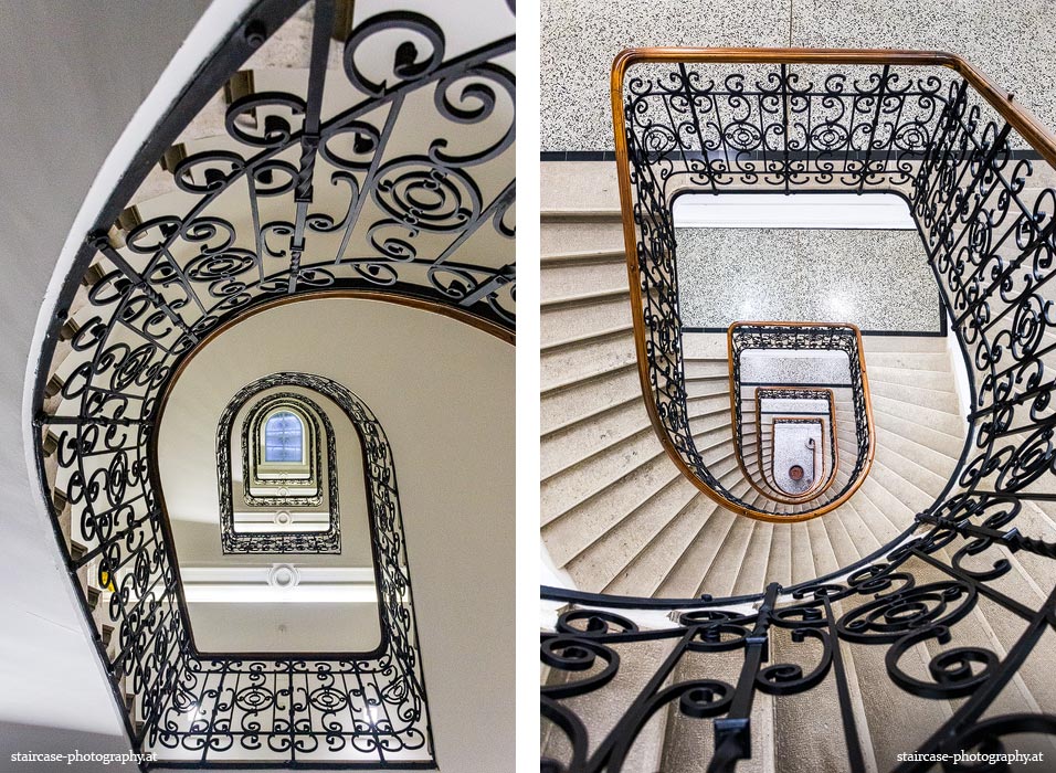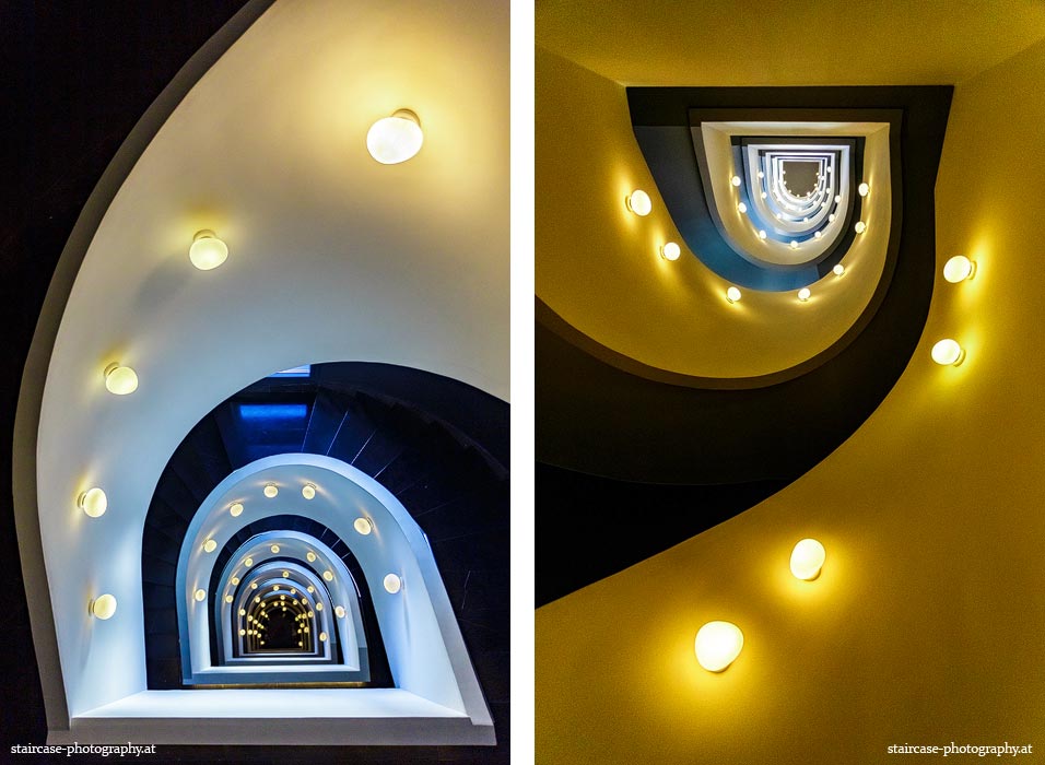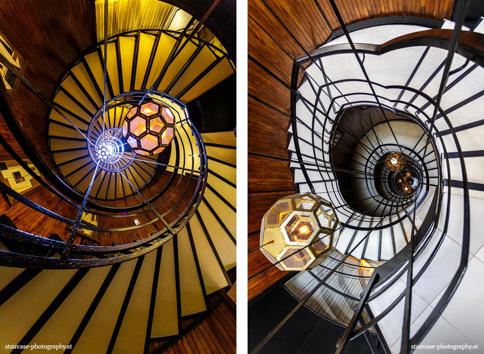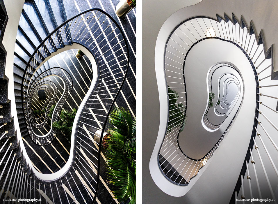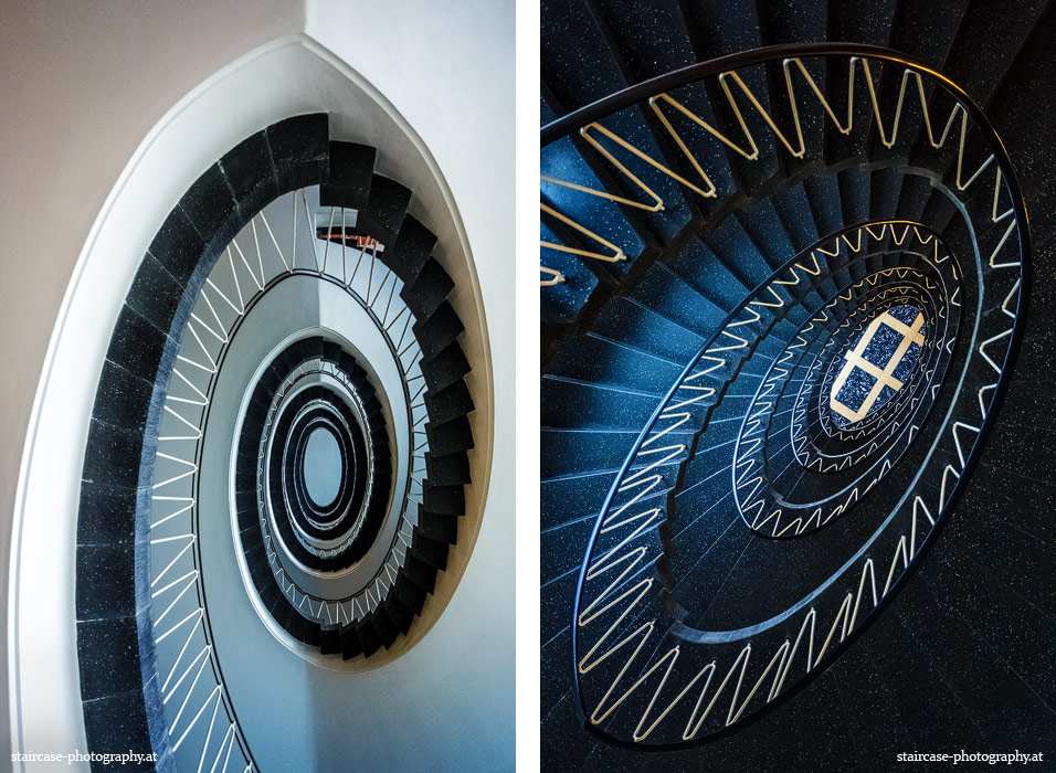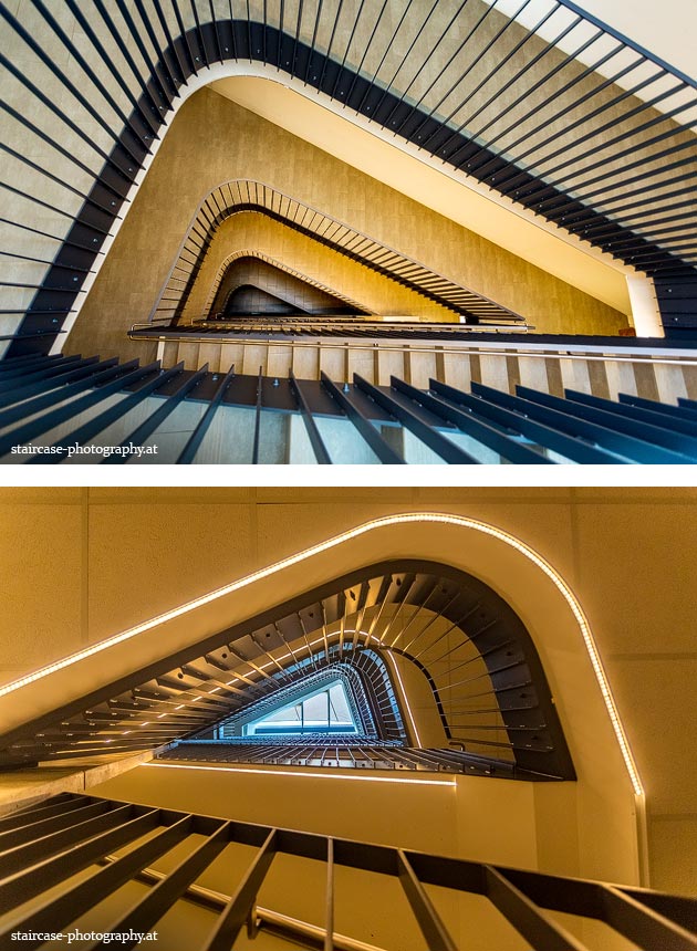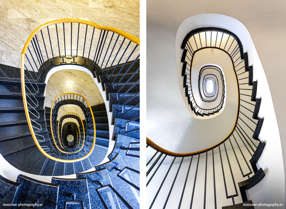 Der Blick von unten nach oben offenbart die Unterseite des Treppenlaufs, das Geländer und an der Spitze ein Deckenmuster. Beim Blick von oben nach unten dagegen bietet sich ein gänzlich anderes Bild, man sieht das Bodenmuster der Treppe, den gefärbten Handlauf und bemerkt eine gänzlich andere Lichtstimmung als zuvor. Einmal präsentiert sich ein und dasselbe Stiegenhaus im Vergleich der Blickwinkel vollkommen anders, ein anderes Mal erkennt man deutlich denselben Charakter von beiden Seiten aus.