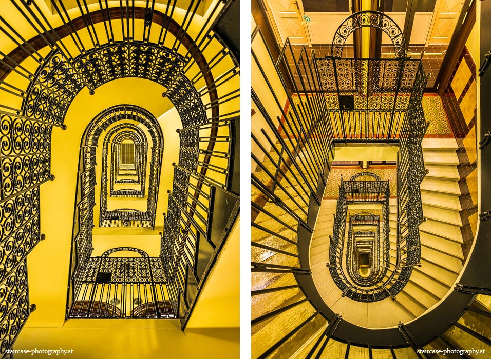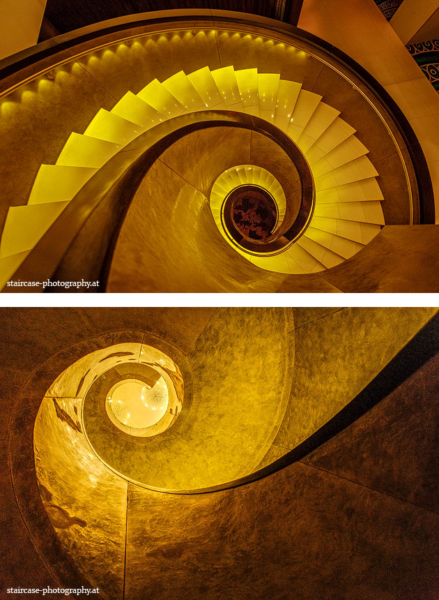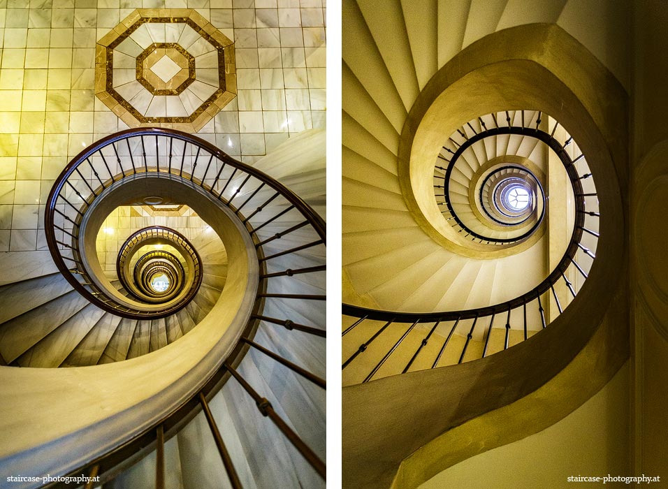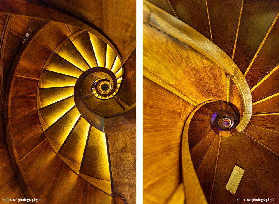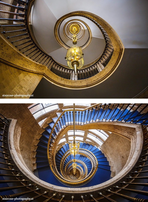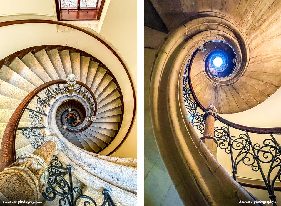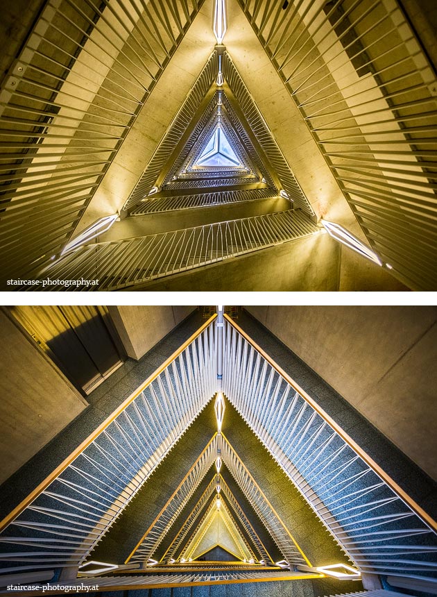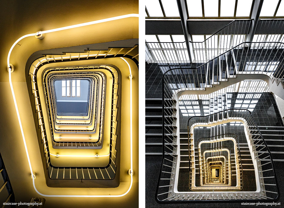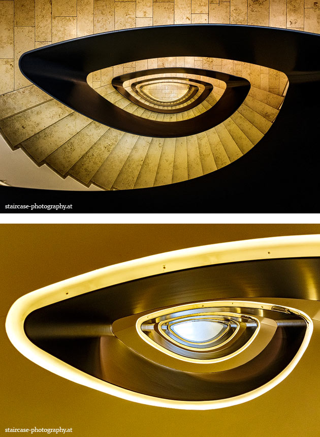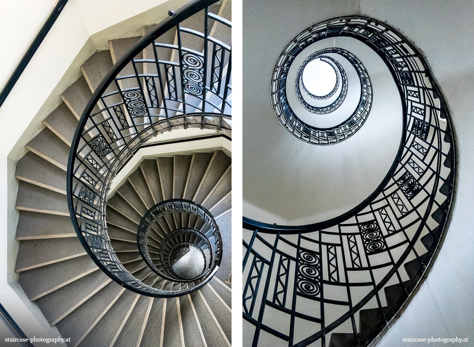 Der Blick von unten nach oben offenbart die Unterseite des Treppenlaufs, das Geländer und an der Spitze ein Deckenmuster. Beim Blick von oben nach unten dagegen bietet sich ein gänzlich anderes Bild, man sieht das Bodenmuster der Treppe, den gefärbten Handlauf und bemerkt eine gänzlich andere Lichtstimmung als zuvor. Einmal präsentiert sich ein und dasselbe Stiegenhaus im Vergleich der Blickwinkel vollkommen anders, ein anderes Mal erkennt man deutlich denselben Charakter von beiden Seiten aus.