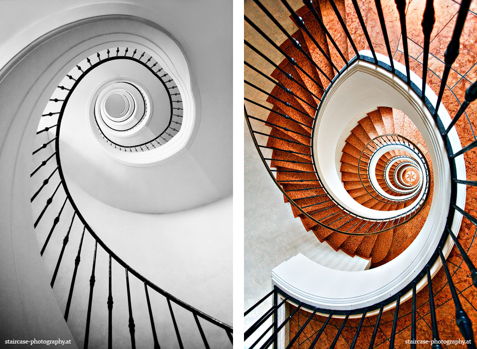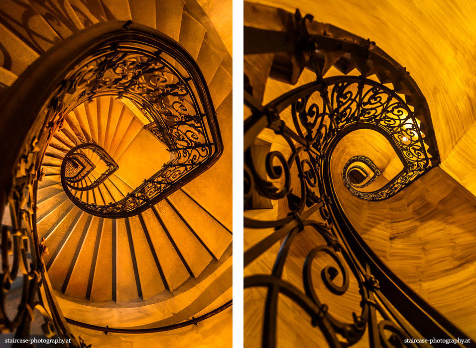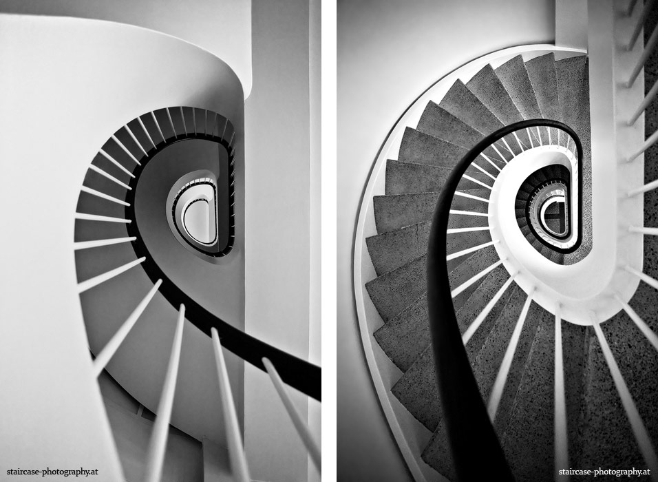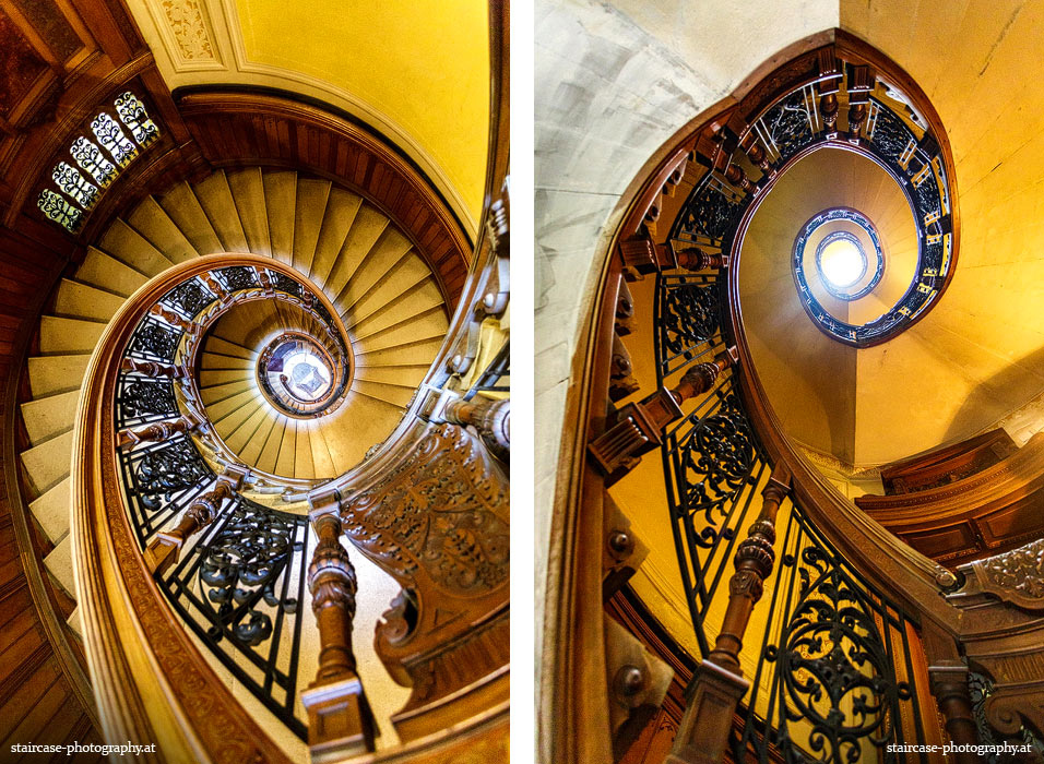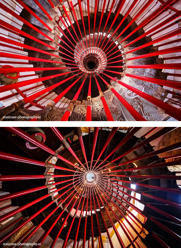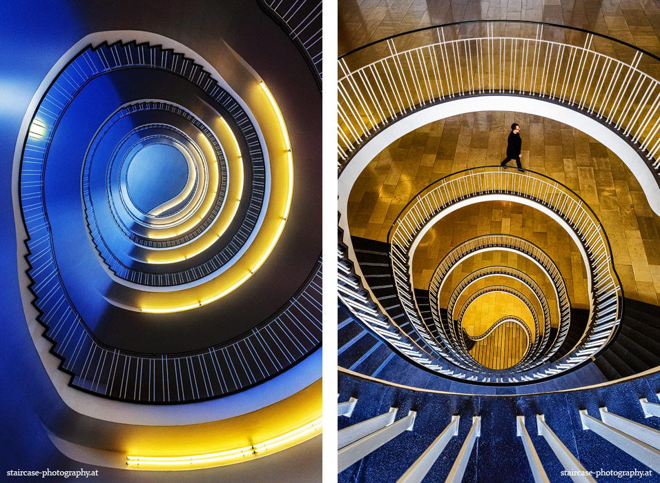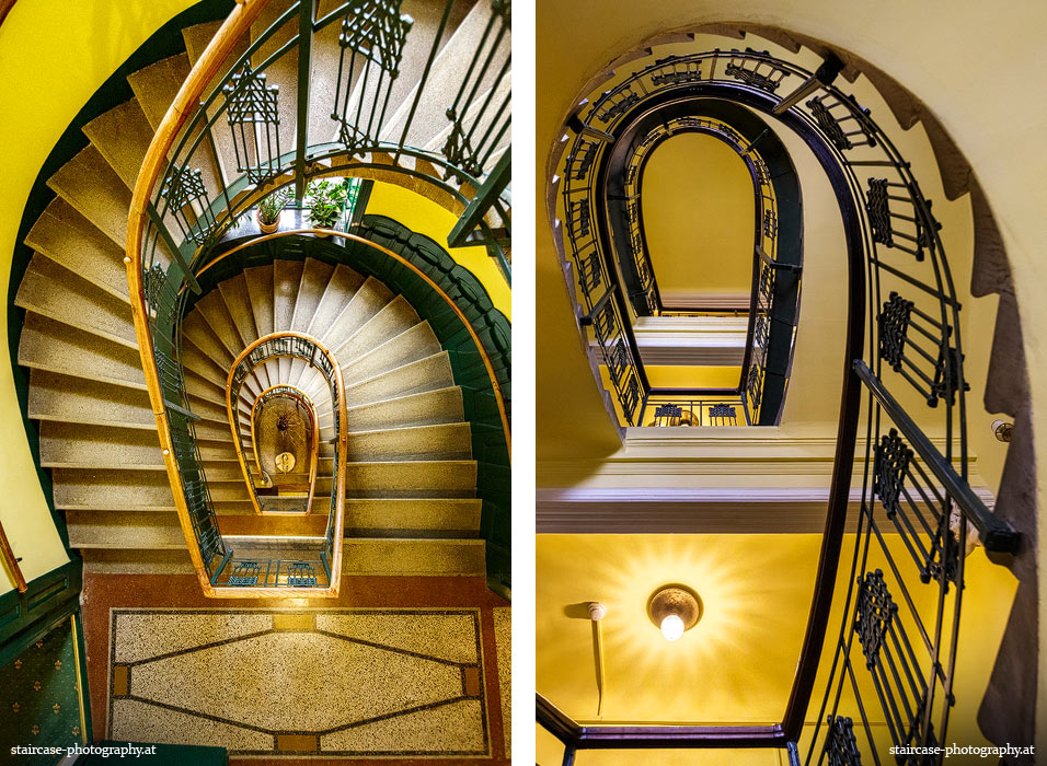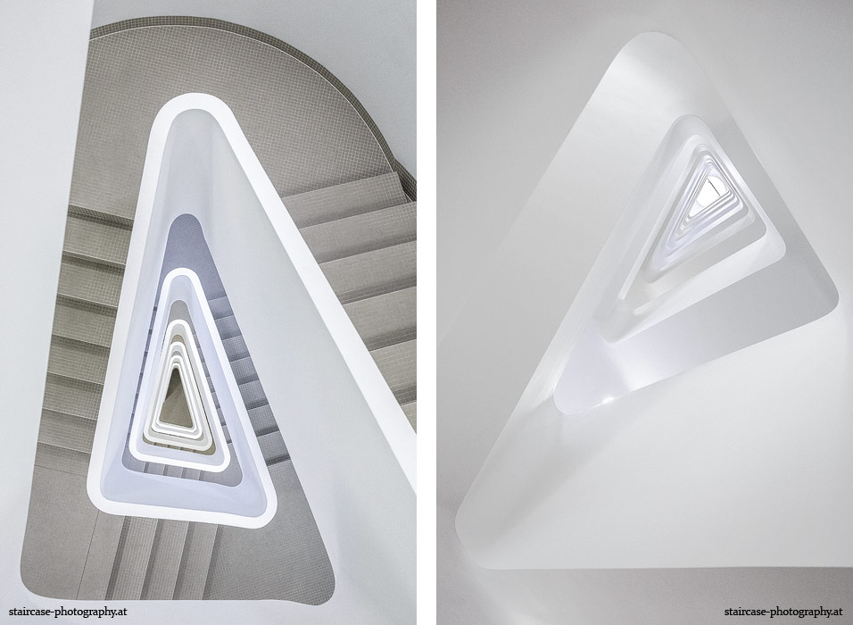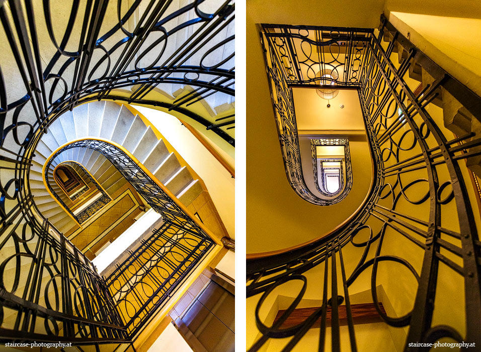 Der Blick von unten nach oben offenbart die Unterseite des Treppenlaufs, das Geländer und an der Spitze ein Deckenmuster. Beim Blick von oben nach unten dagegen bietet sich ein gänzlich anderes Bild, man sieht das Bodenmuster der Treppe, den gefärbten Handlauf und bemerkt eine gänzlich andere Lichtstimmung als zuvor. Einmal präsentiert sich ein und dasselbe Stiegenhaus im Vergleich der Blickwinkel vollkommen anders, ein anderes Mal erkennt man deutlich denselben Charakter von beiden Seiten aus.