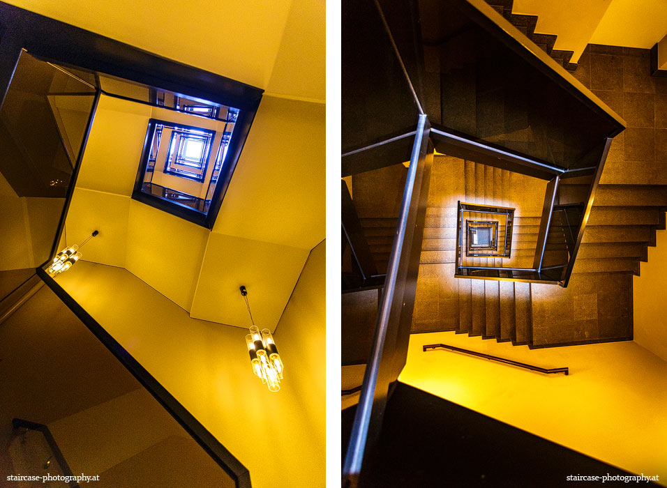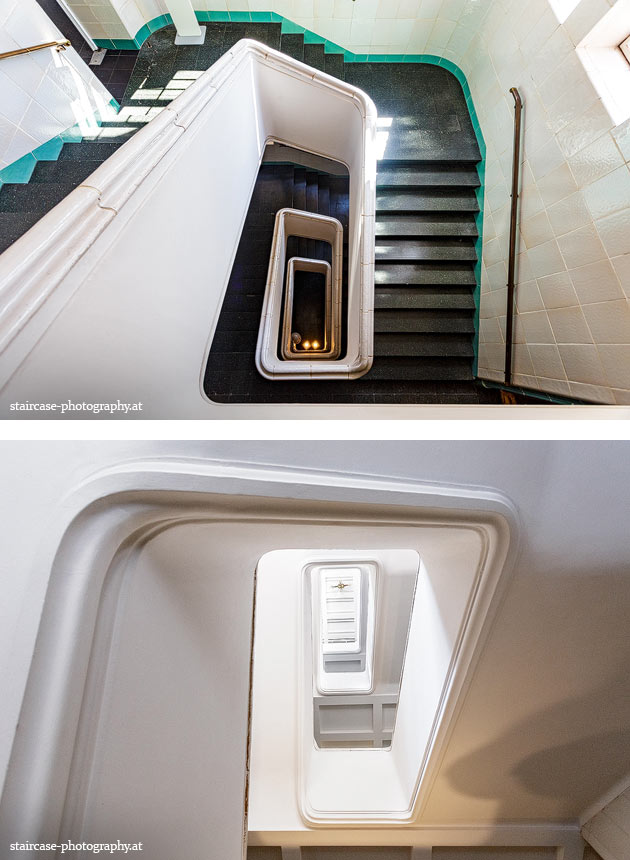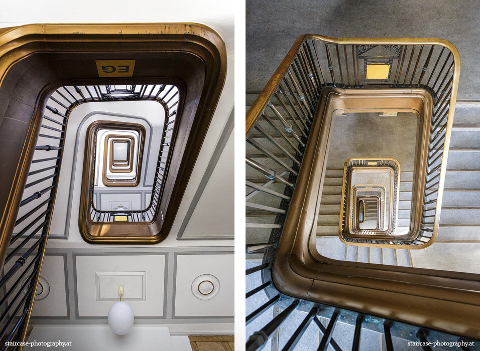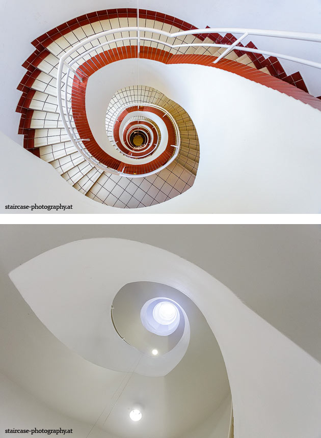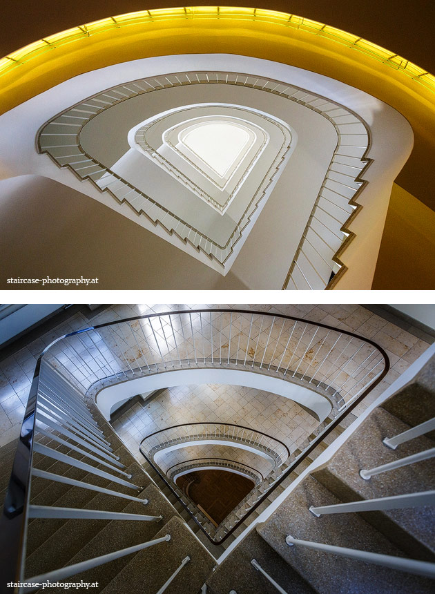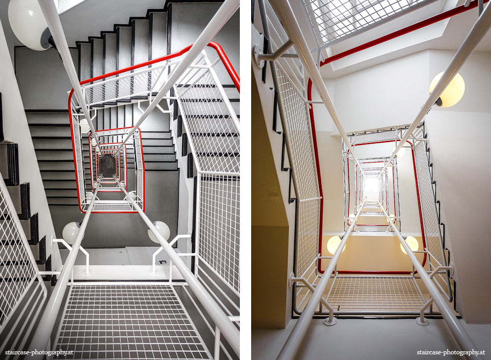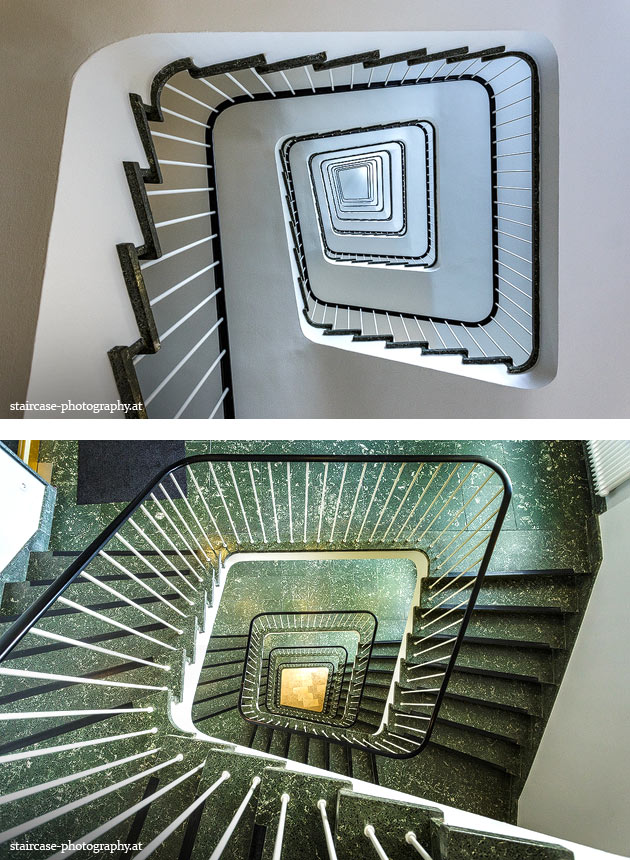 Der Blick von unten nach oben offenbart die Unterseite des Treppenlaufs, das Geländer und an der Spitze ein Deckenmuster. Beim Blick von oben nach unten dagegen bietet sich ein gänzlich anderes Bild, man sieht das Bodenmuster der Treppe, den gefärbten Handlauf und bemerkt eine gänzlich andere Lichtstimmung als zuvor. Einmal präsentiert sich ein und dasselbe Stiegenhaus im Vergleich der Blickwinkel vollkommen anders, ein anderes Mal erkennt man deutlich denselben Charakter von beiden Seiten aus.