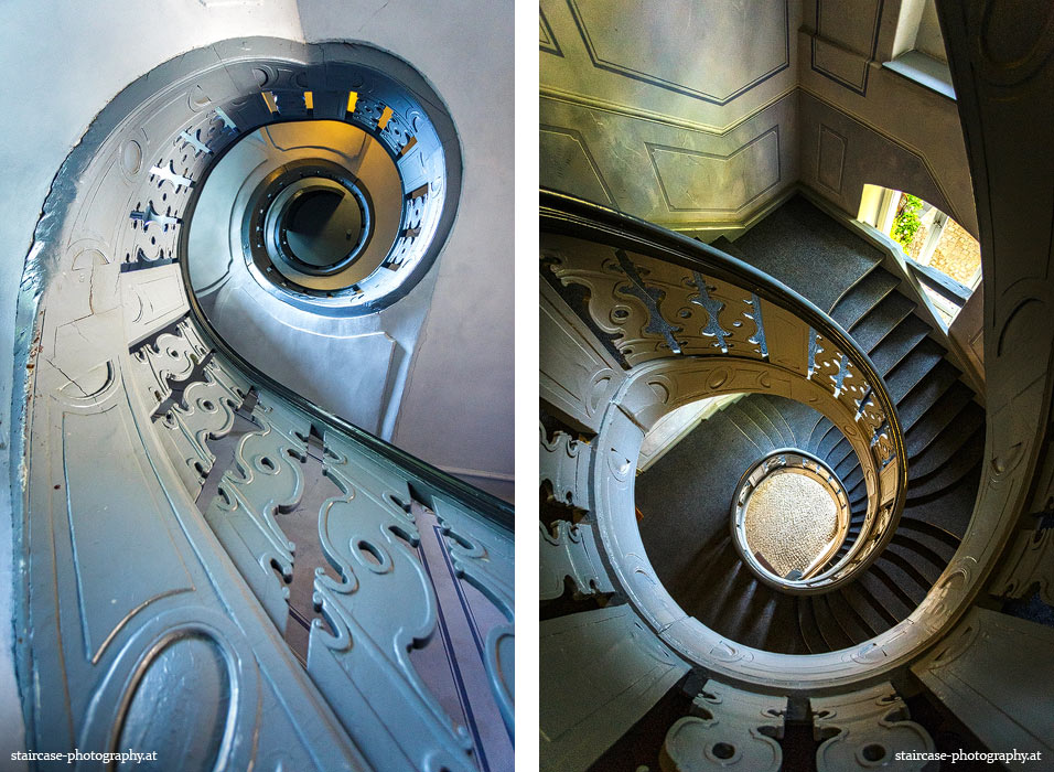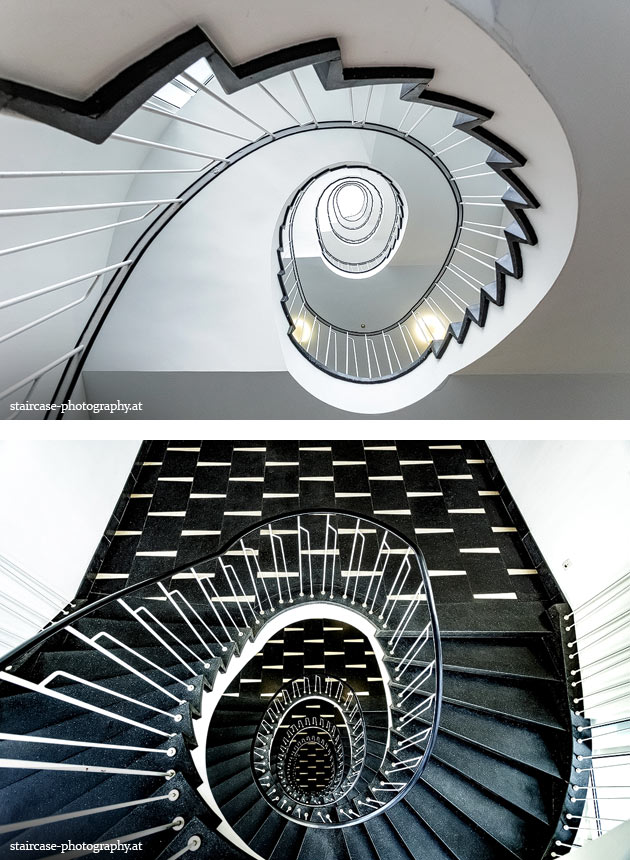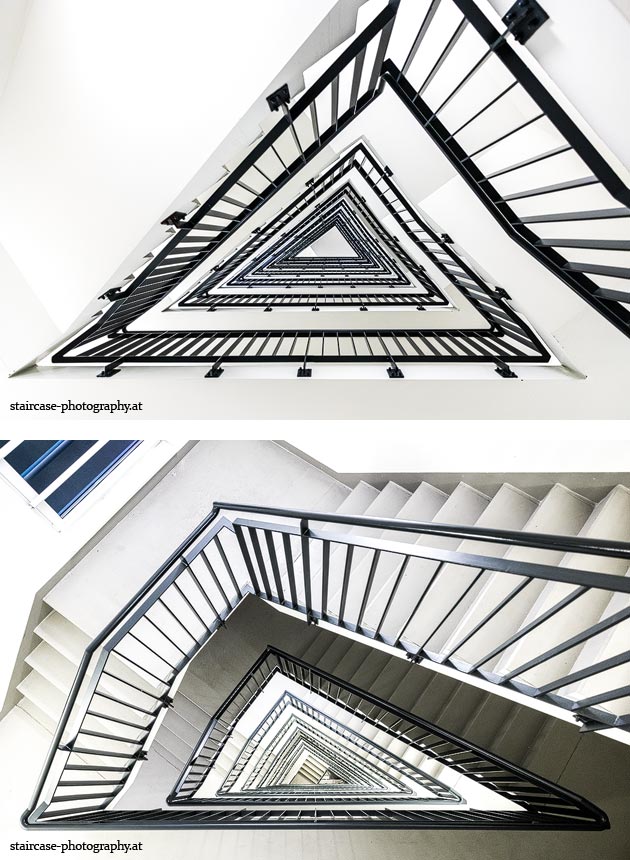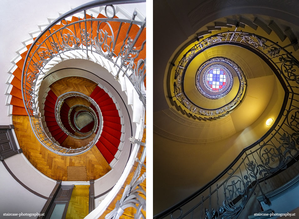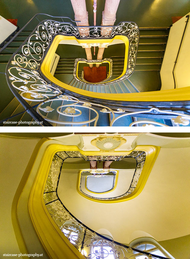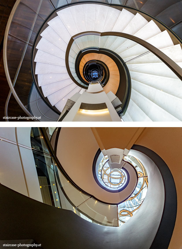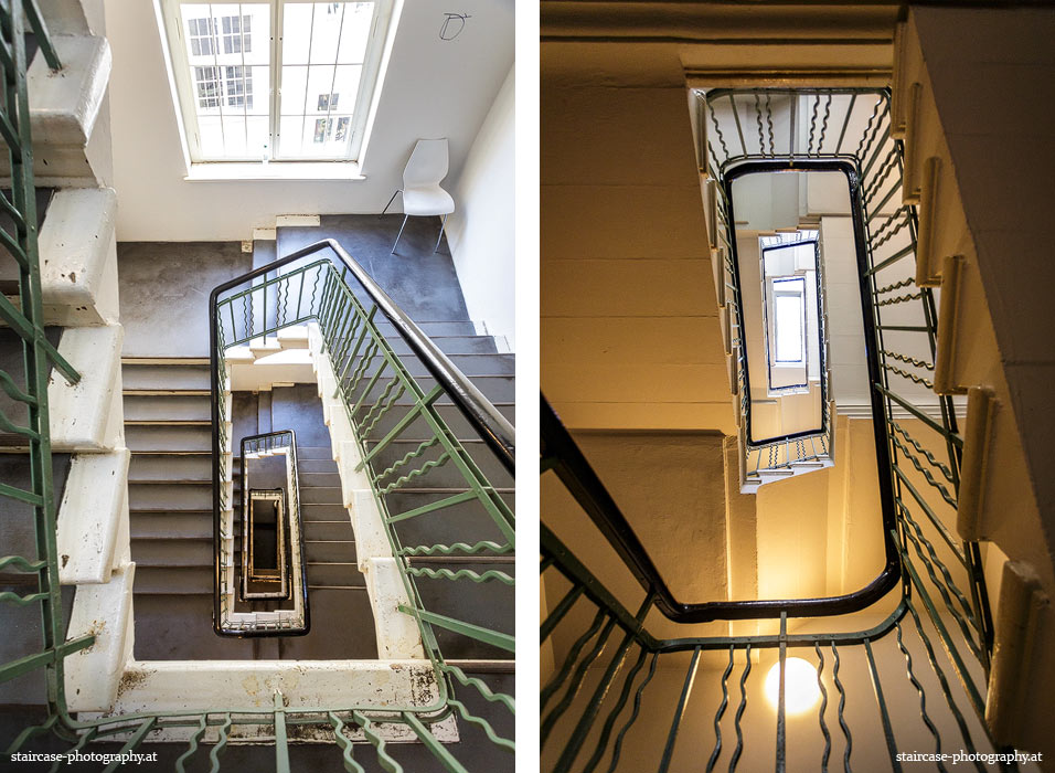 Der Blick von unten nach oben offenbart die Unterseite des Treppenlaufs, das Geländer und an der Spitze ein Deckenmuster. Beim Blick von oben nach unten dagegen bietet sich ein gänzlich anderes Bild, man sieht das Bodenmuster der Treppe, den gefärbten Handlauf und bemerkt eine gänzlich andere Lichtstimmung als zuvor. Einmal präsentiert sich ein und dasselbe Stiegenhaus im Vergleich der Blickwinkel vollkommen anders, ein anderes Mal erkennt man deutlich denselben Charakter von beiden Seiten aus.