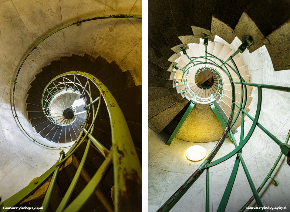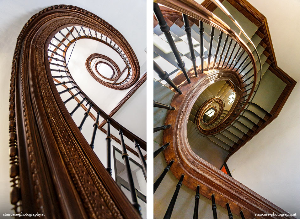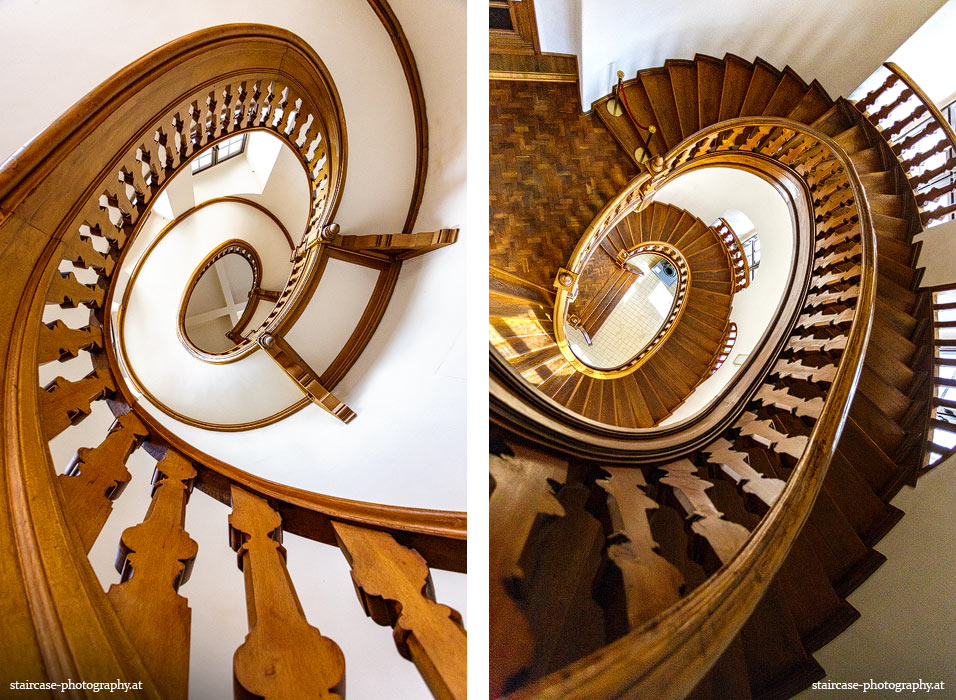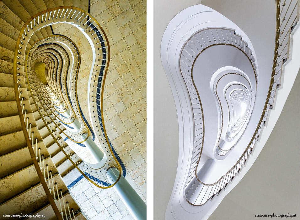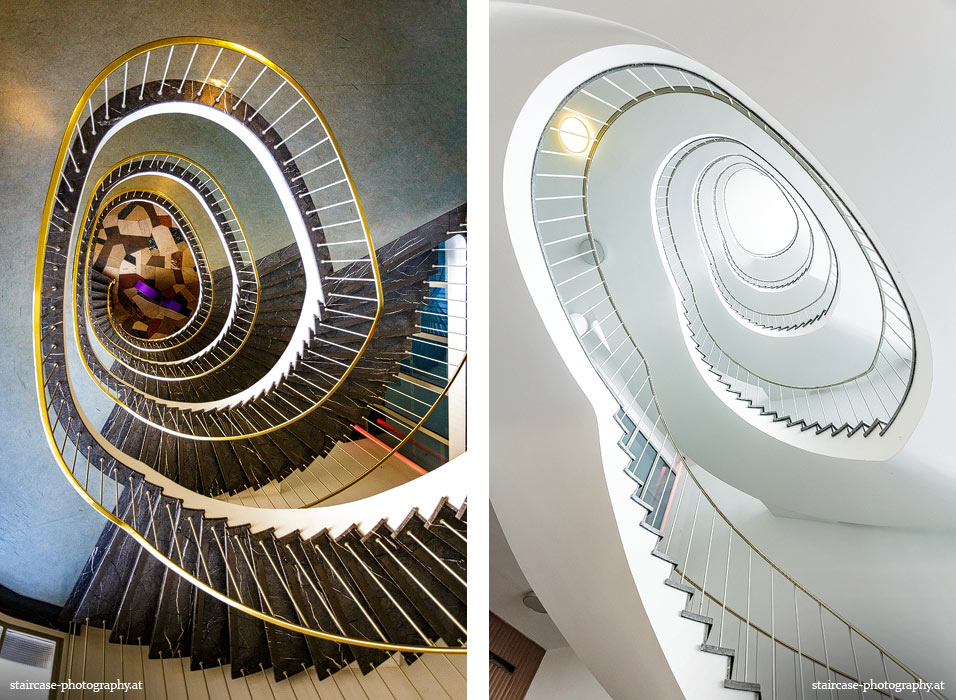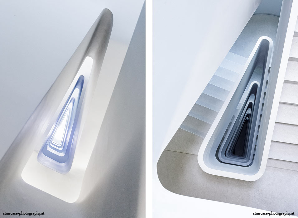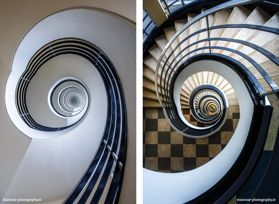 Der Blick von unten nach oben offenbart die Unterseite des Treppenlaufs, das Geländer und an der Spitze ein Deckenmuster. Beim Blick von oben nach unten dagegen bietet sich ein gänzlich anderes Bild, man sieht das Bodenmuster der Treppe, den gefärbten Handlauf und bemerkt eine gänzlich andere Lichtstimmung als zuvor. Einmal präsentiert sich ein und dasselbe Stiegenhaus im Vergleich der Blickwinkel vollkommen anders, ein anderes Mal erkennt man deutlich denselben Charakter von beiden Seiten aus.