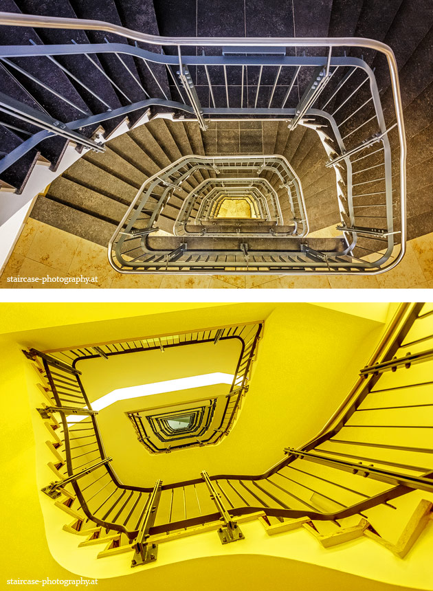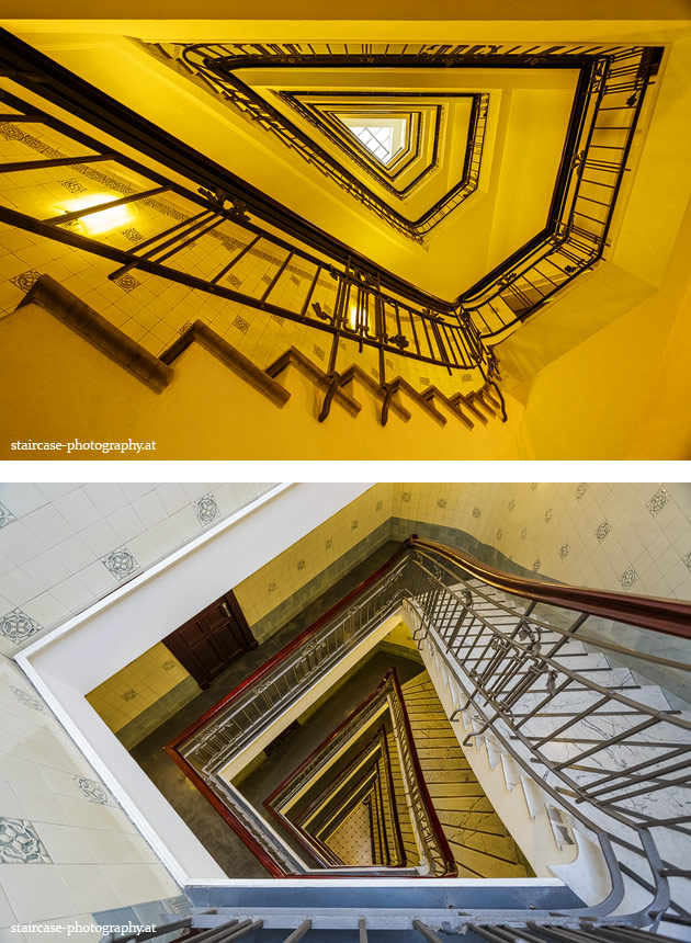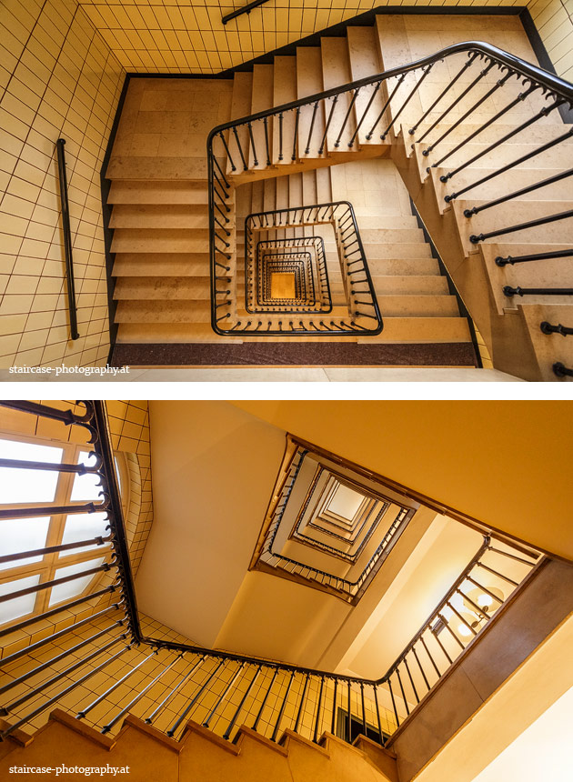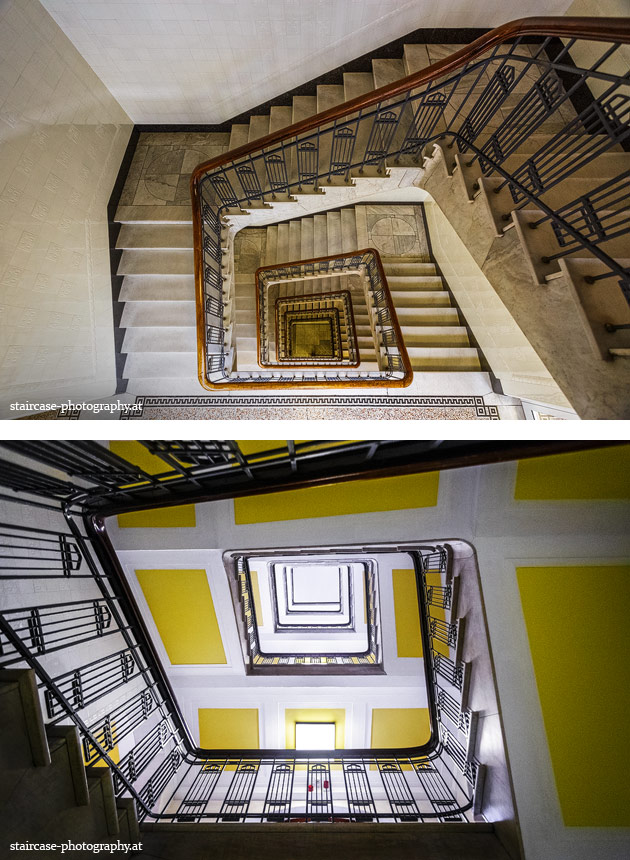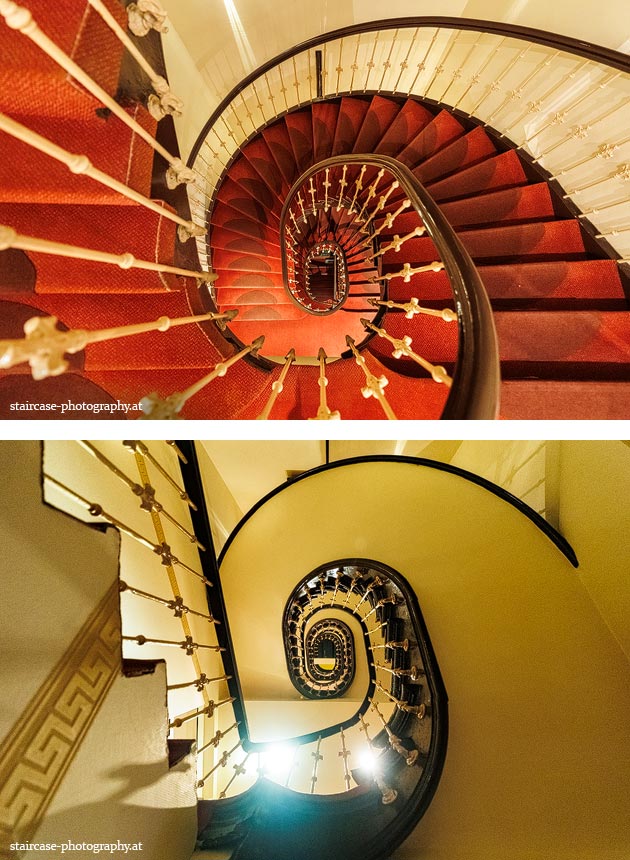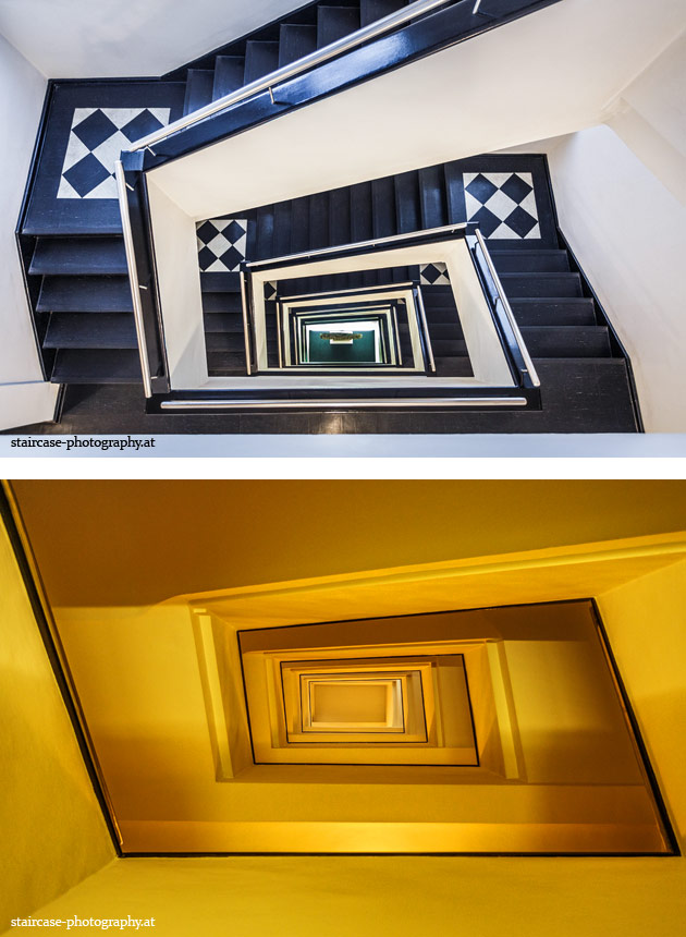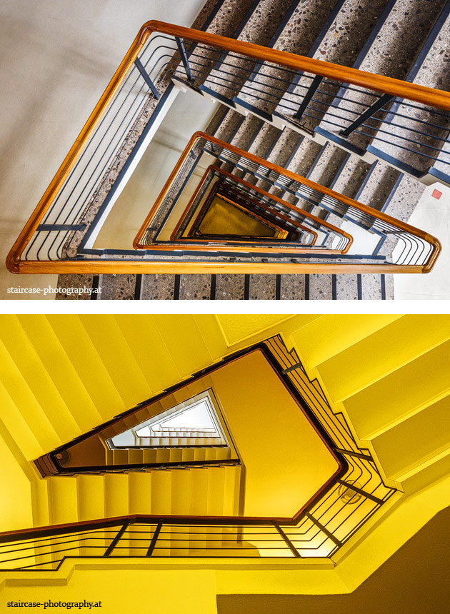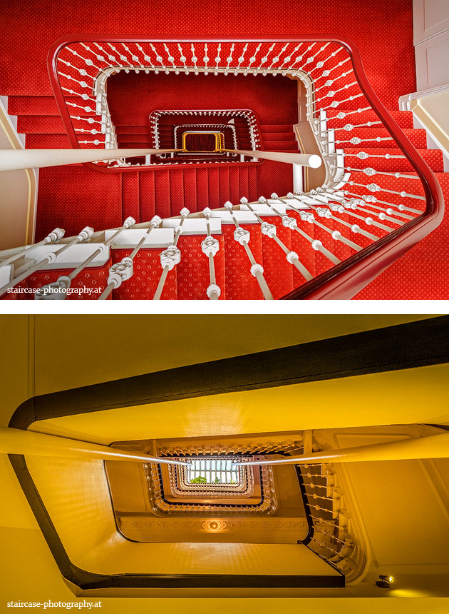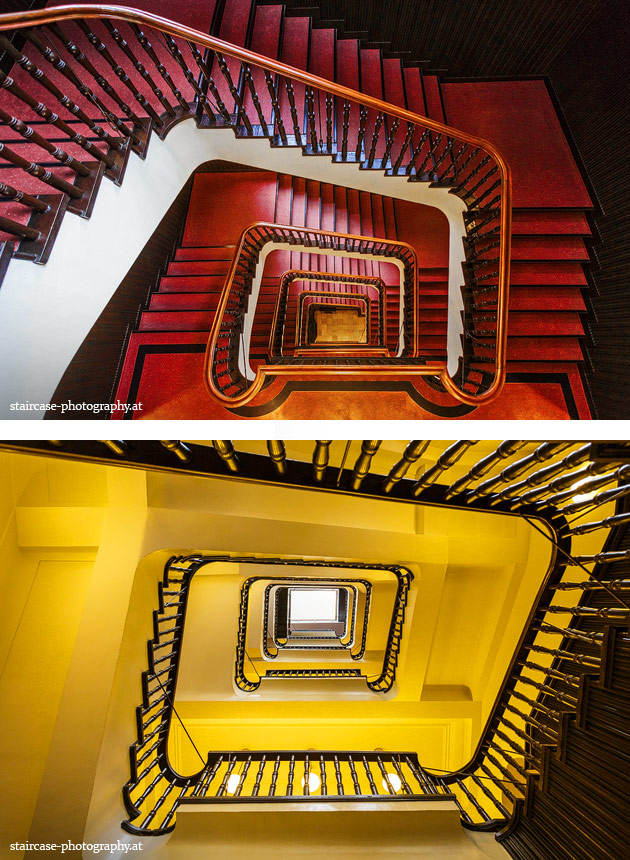 Der Blick von unten nach oben offenbart die Unterseite des Treppenlaufs, das Geländer und an der Spitze ein Deckenmuster. Beim Blick von oben nach unten dagegen bietet sich ein gänzlich anderes Bild, man sieht das Bodenmuster der Treppe, den gefärbten Handlauf und bemerkt eine gänzlich andere Lichtstimmung als zuvor. Einmal präsentiert sich ein und dasselbe Stiegenhaus im Vergleich der Blickwinkel vollkommen anders, ein anderes Mal erkennt man deutlich denselben Charakter von beiden Seiten aus.