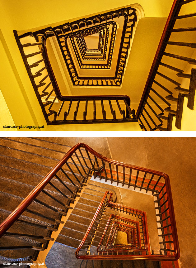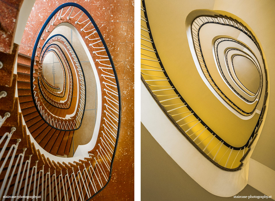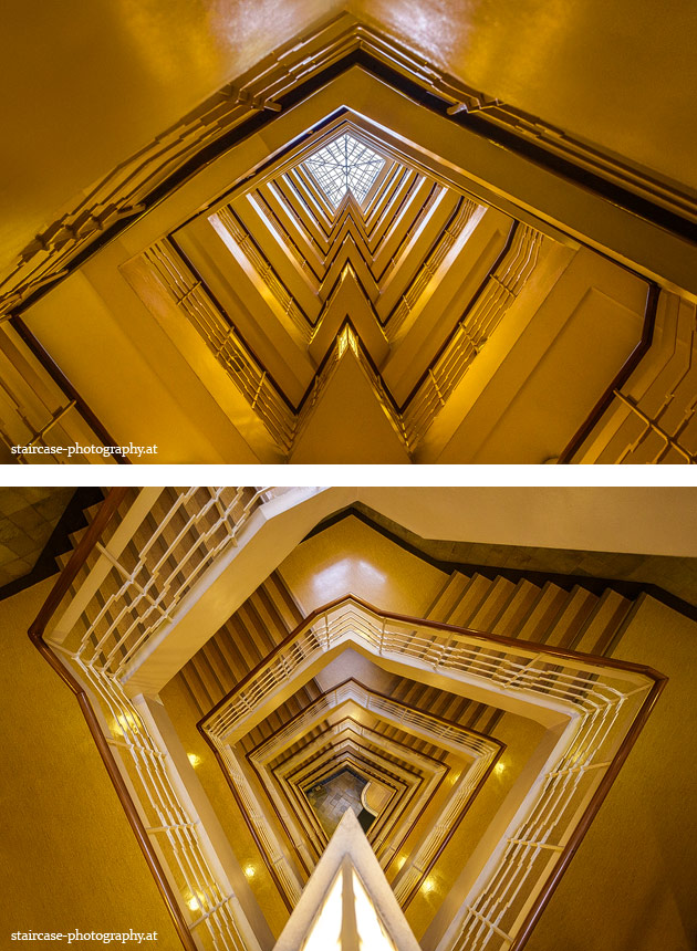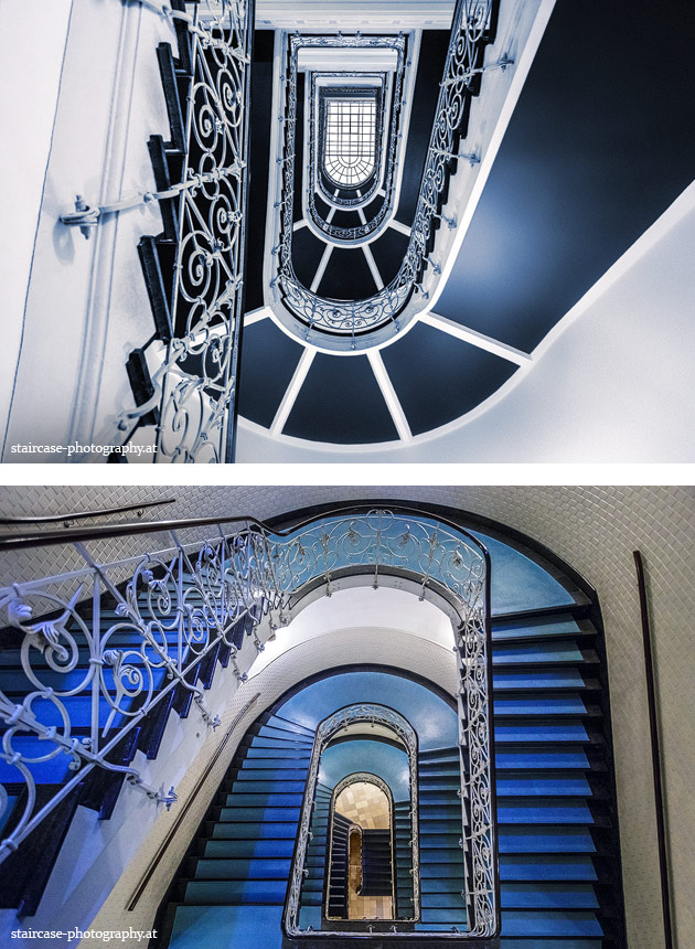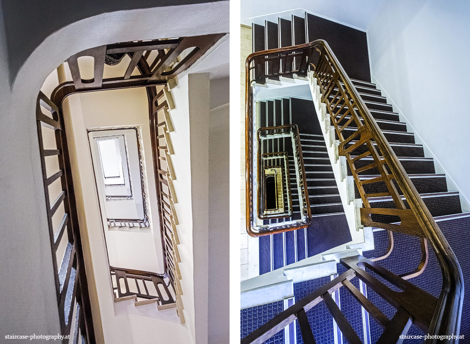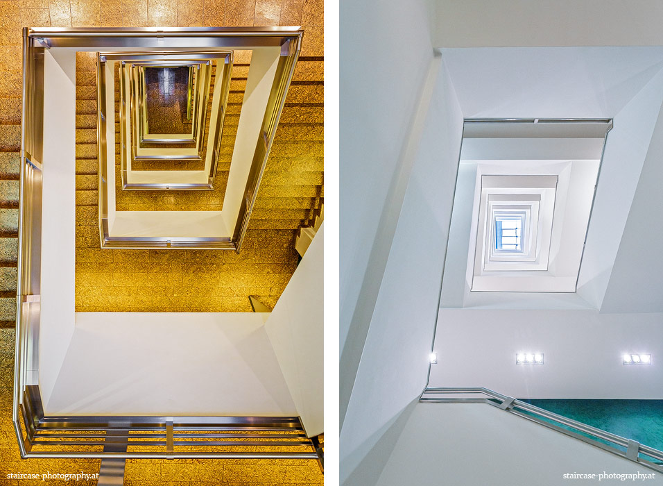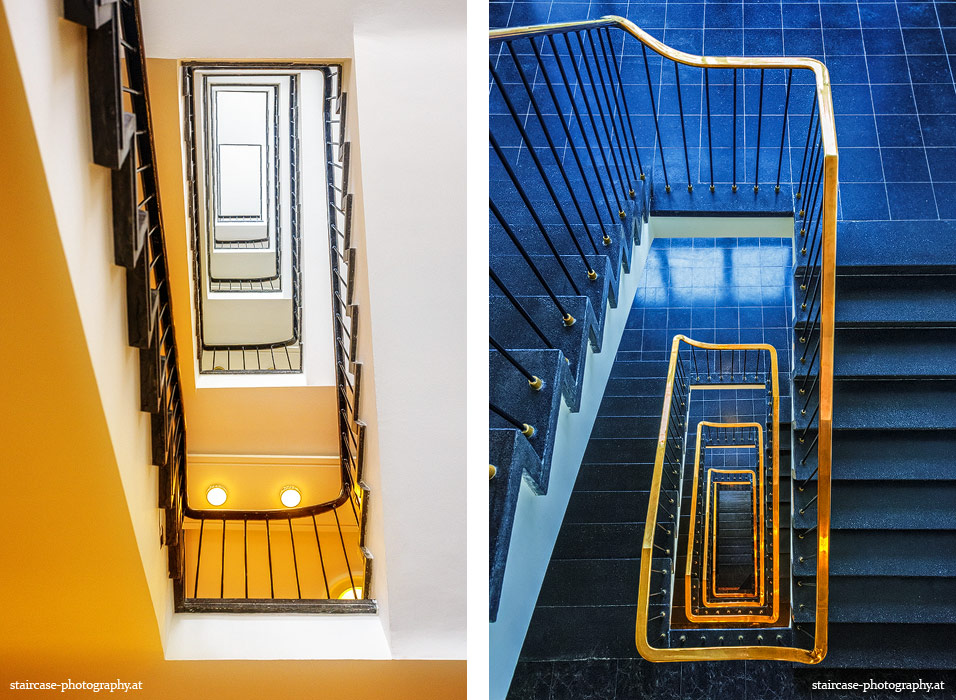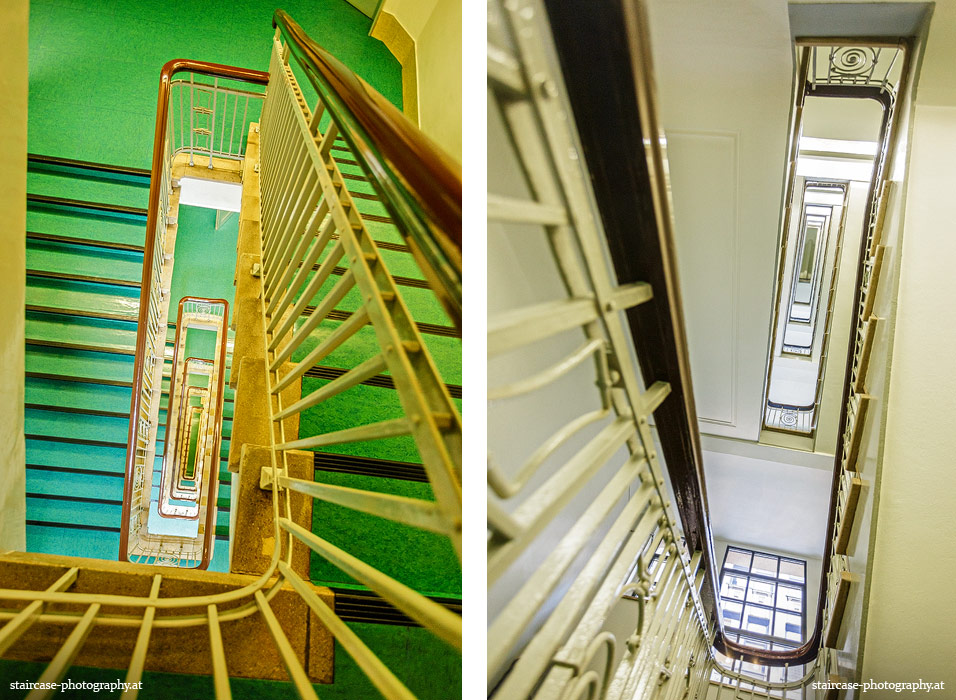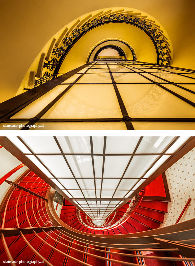 Der Blick von unten nach oben offenbart die Unterseite des Treppenlaufs, das Geländer und an der Spitze ein Deckenmuster. Beim Blick von oben nach unten dagegen bietet sich ein gänzlich anderes Bild, man sieht das Bodenmuster der Treppe, den gefärbten Handlauf und bemerkt eine gänzlich andere Lichtstimmung als zuvor. Einmal präsentiert sich ein und dasselbe Stiegenhaus im Vergleich der Blickwinkel vollkommen anders, ein anderes Mal erkennt man deutlich denselben Charakter von beiden Seiten aus.