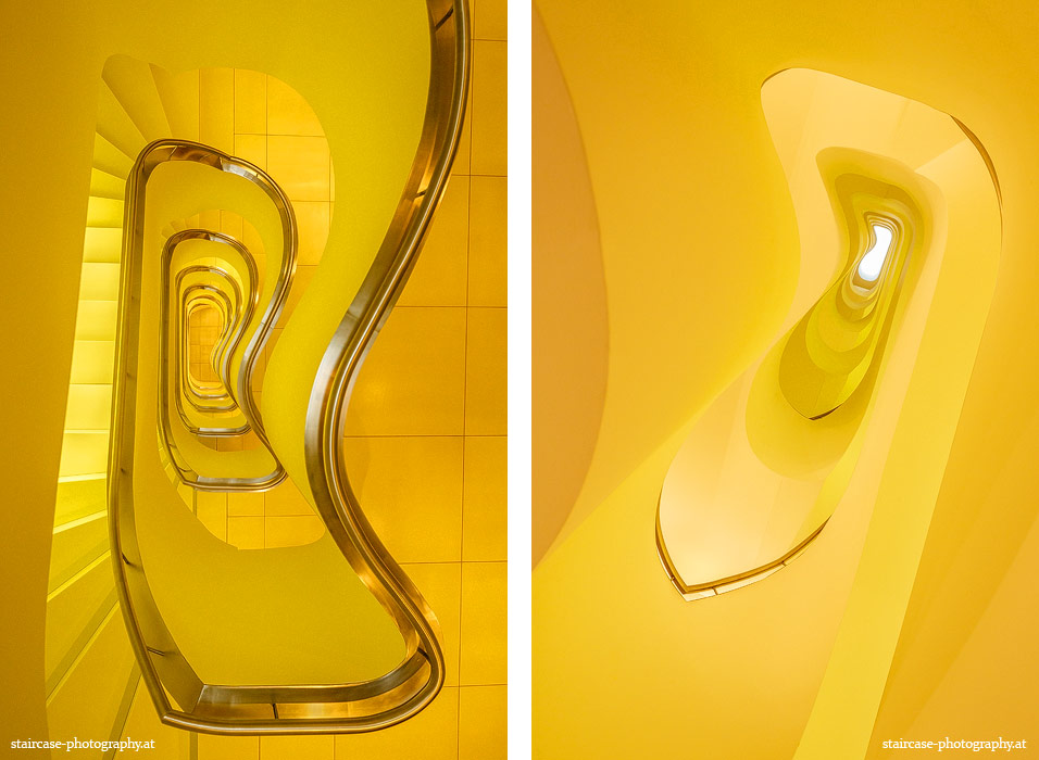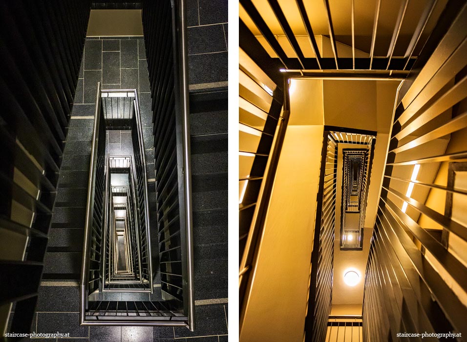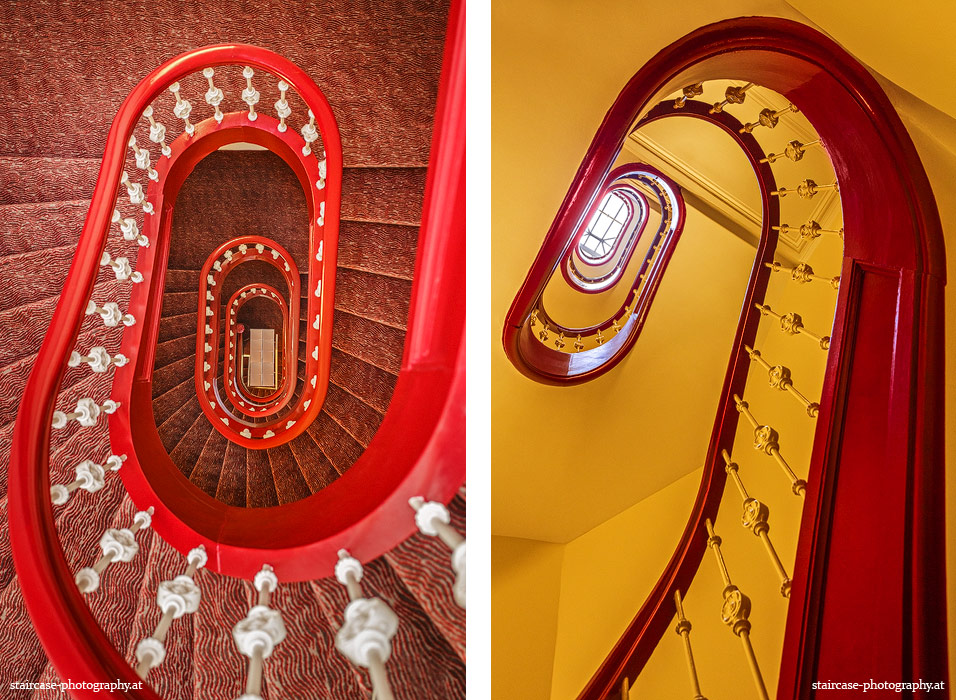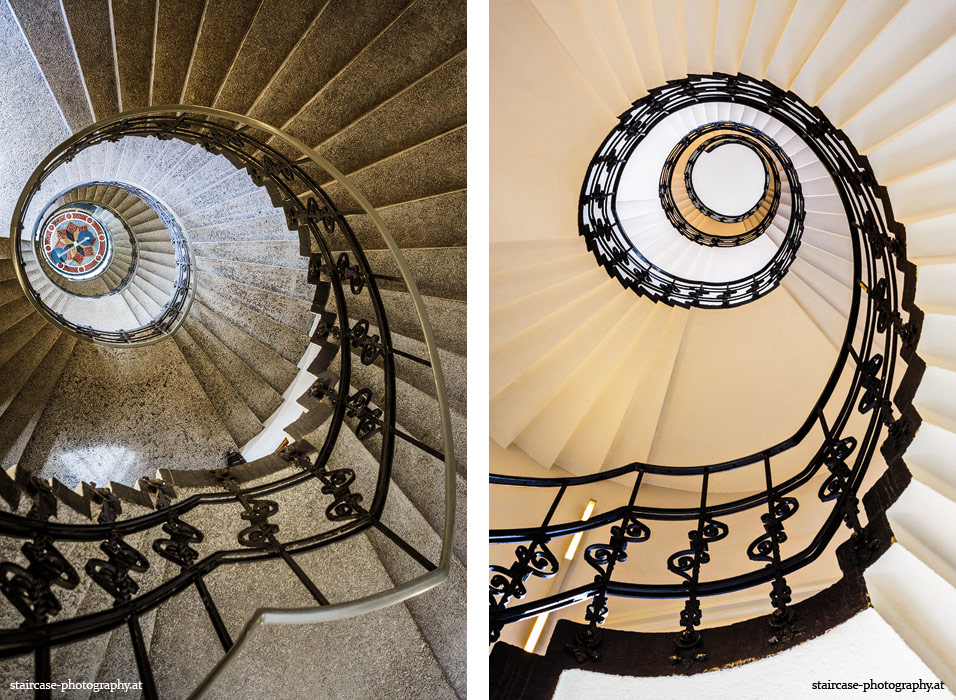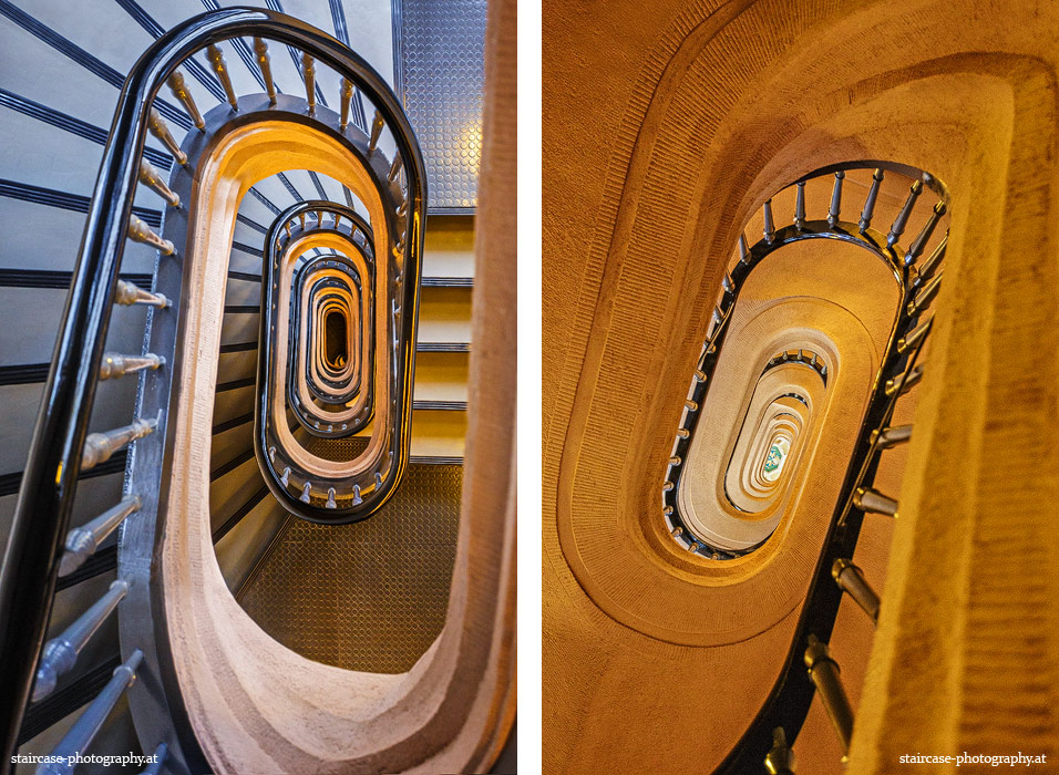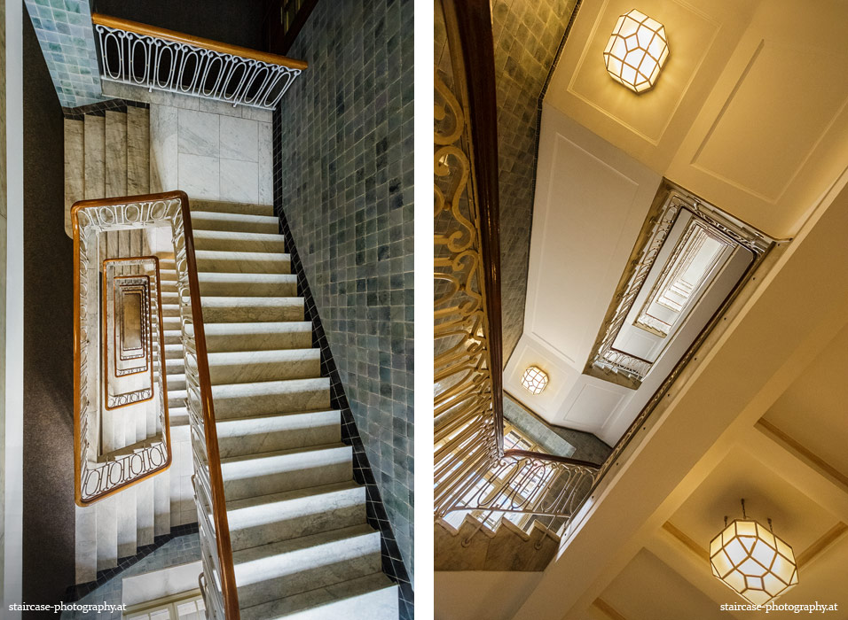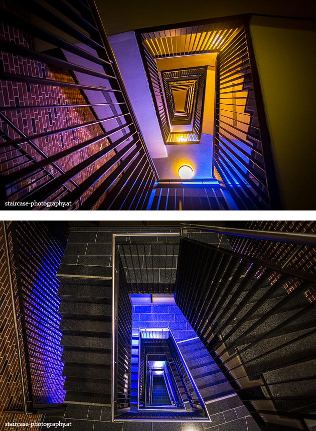 Der Blick von unten nach oben offenbart die Unterseite des Treppenlaufs, das Geländer und an der Spitze ein Deckenmuster. Beim Blick von oben nach unten dagegen bietet sich ein gänzlich anderes Bild, man sieht das Bodenmuster der Treppe, den gefärbten Handlauf und bemerkt eine gänzlich andere Lichtstimmung als zuvor. Einmal präsentiert sich ein und dasselbe Stiegenhaus im Vergleich der Blickwinkel vollkommen anders, ein anderes Mal erkennt man deutlich denselben Charakter von beiden Seiten aus.