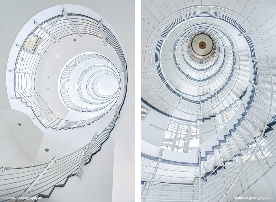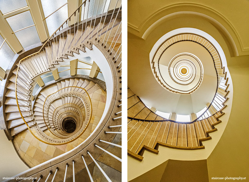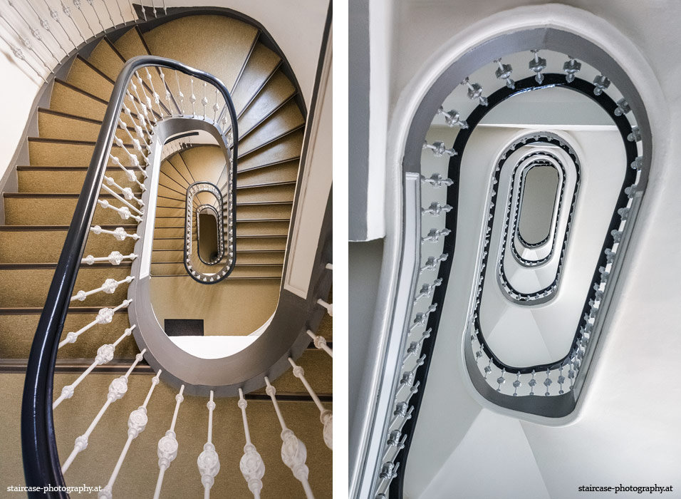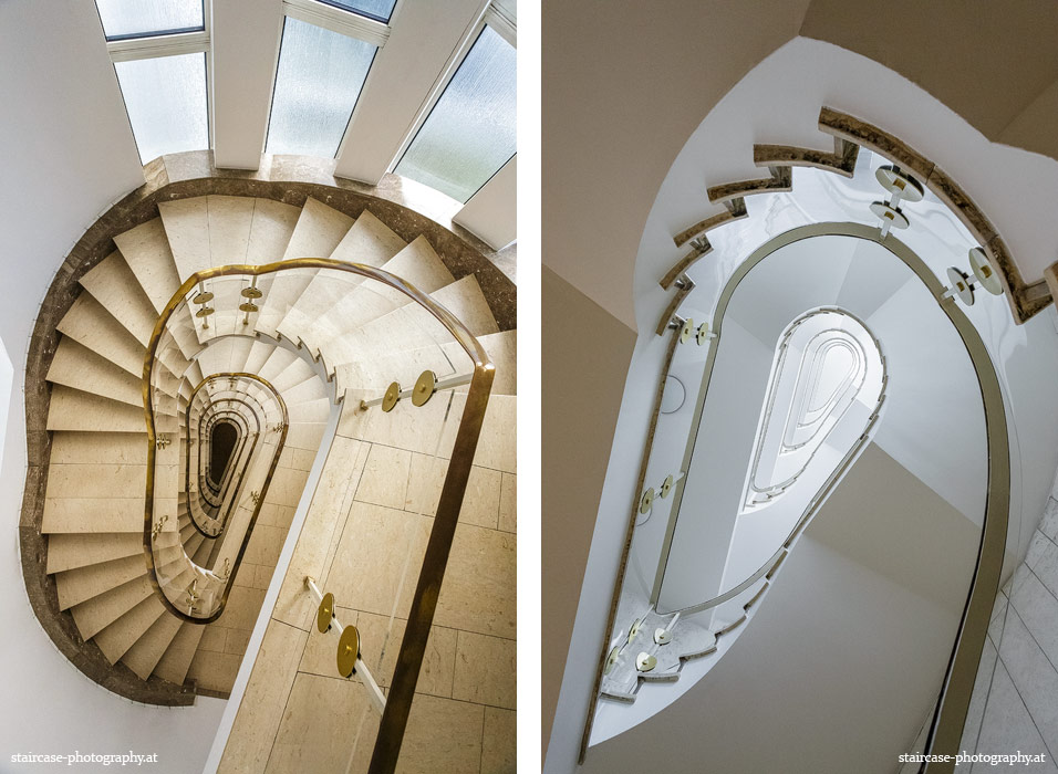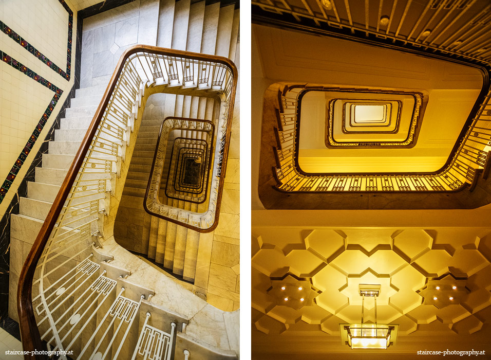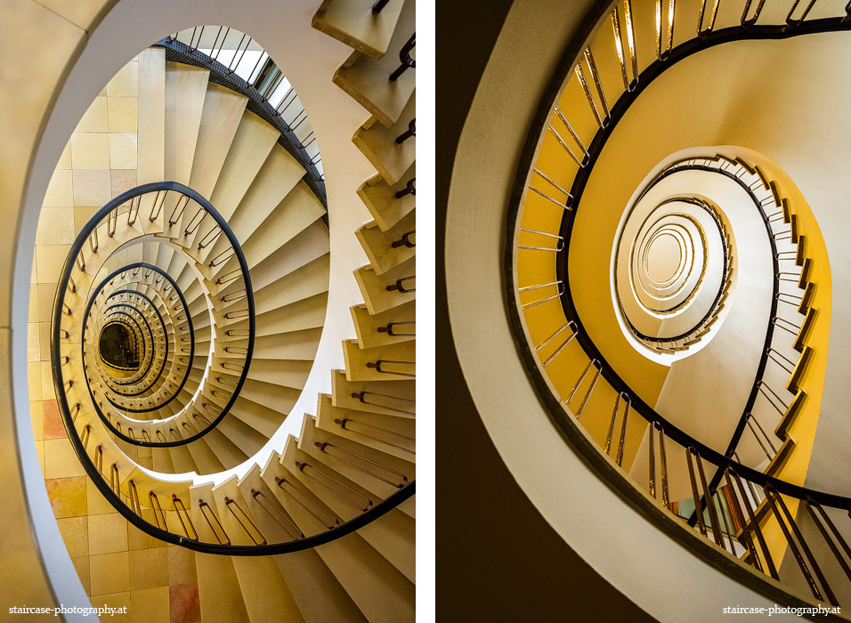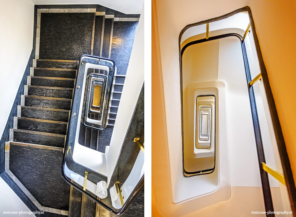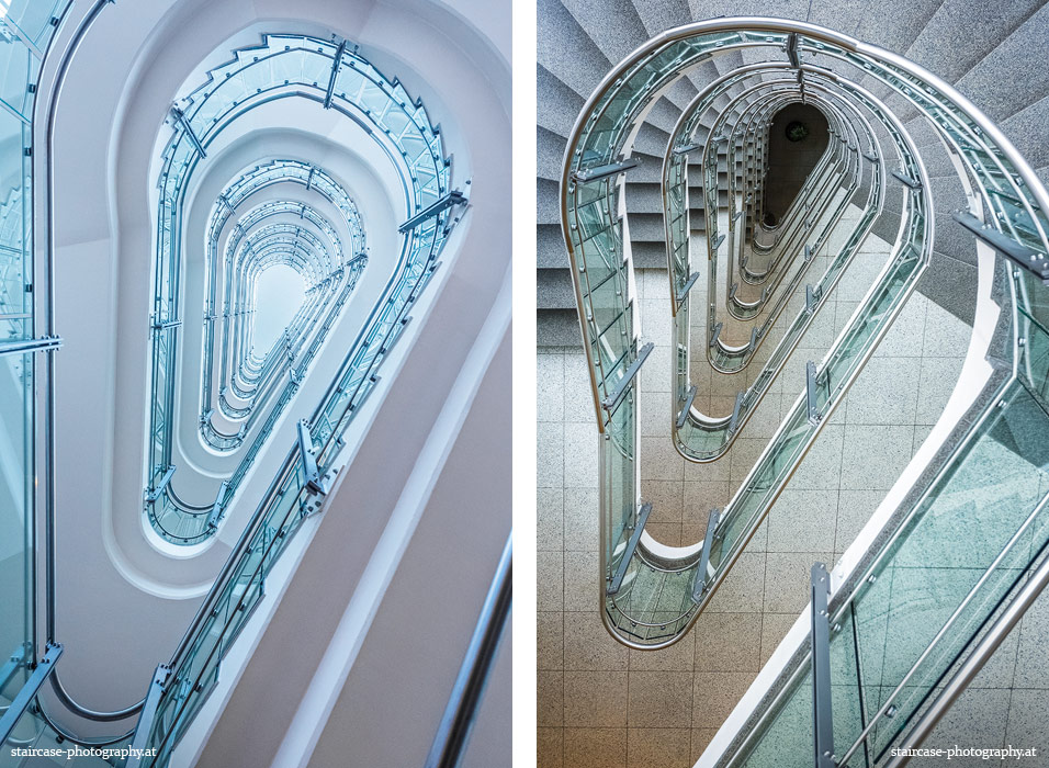 Der Blick von unten nach oben offenbart die Unterseite des Treppenlaufs, das Geländer und an der Spitze ein Deckenmuster. Beim Blick von oben nach unten dagegen bietet sich ein gänzlich anderes Bild, man sieht das Bodenmuster der Treppe, den gefärbten Handlauf und bemerkt eine gänzlich andere Lichtstimmung als zuvor. Einmal präsentiert sich ein und dasselbe Stiegenhaus im Vergleich der Blickwinkel vollkommen anders, ein anderes Mal erkennt man deutlich denselben Charakter von beiden Seiten aus.