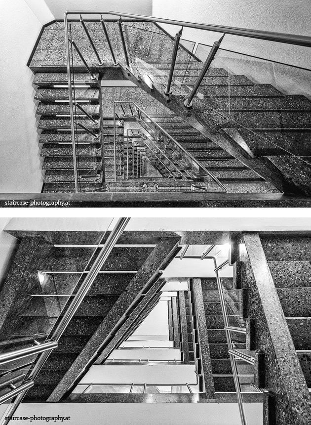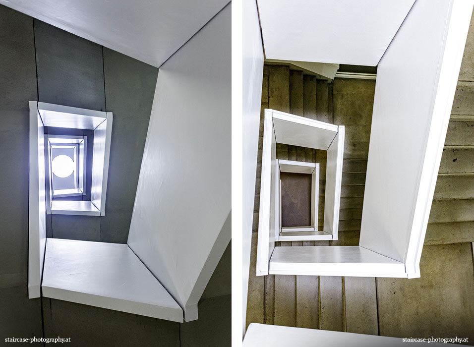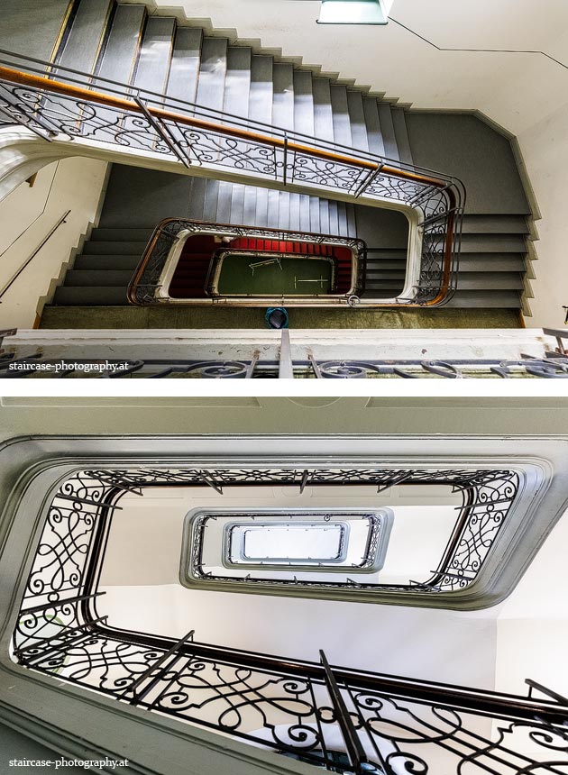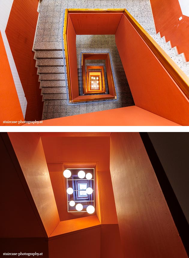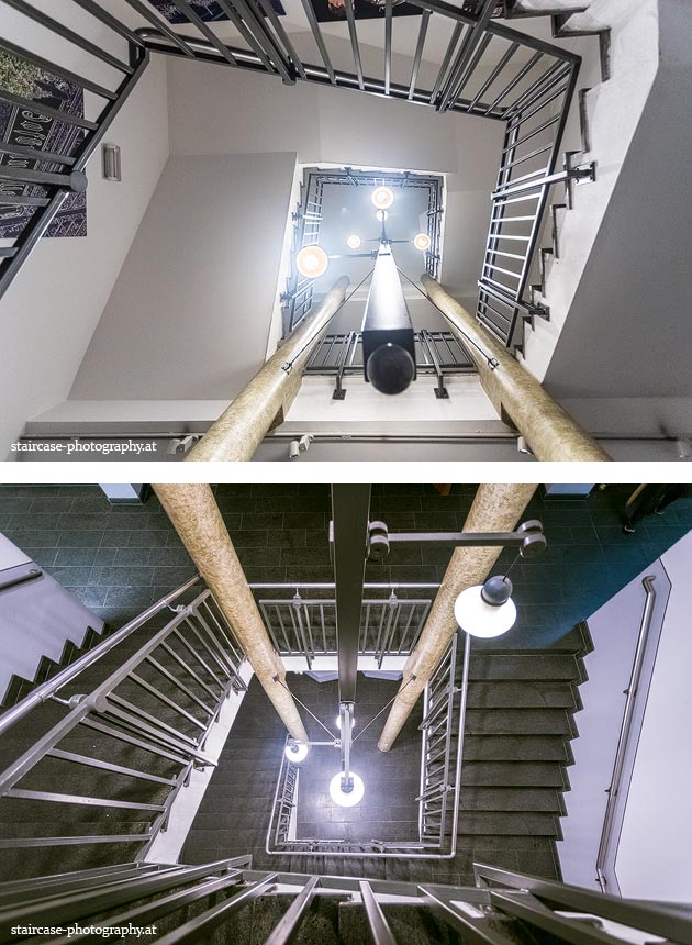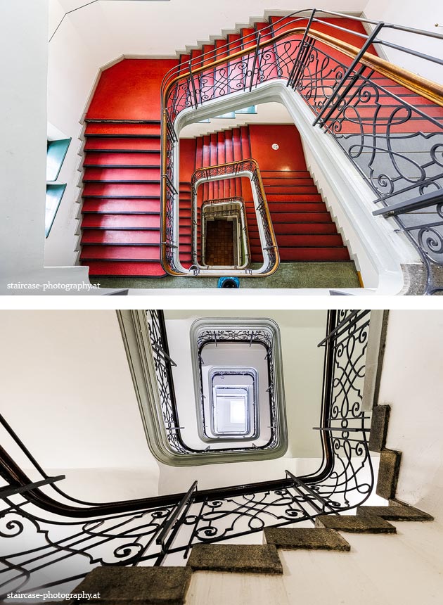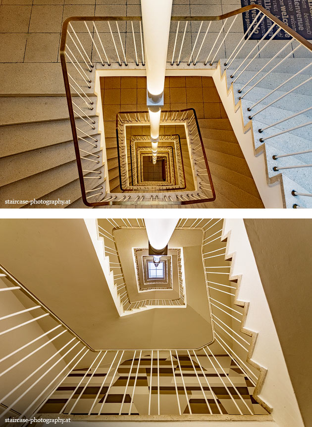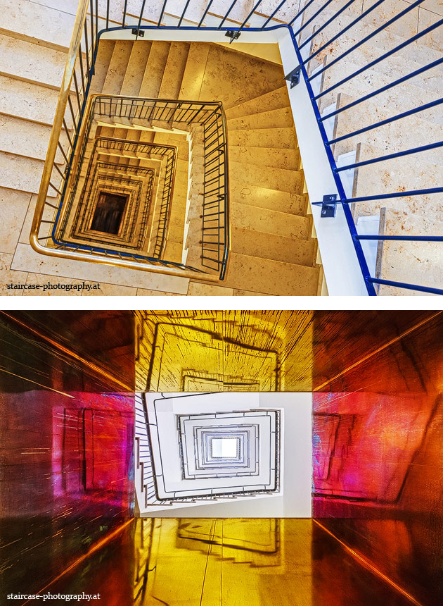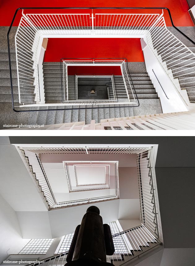 Der Blick von unten nach oben offenbart die Unterseite des Treppenlaufs, das Geländer und an der Spitze ein Deckenmuster. Beim Blick von oben nach unten dagegen bietet sich ein gänzlich anderes Bild, man sieht das Bodenmuster der Treppe, den gefärbten Handlauf und bemerkt eine gänzlich andere Lichtstimmung als zuvor. Einmal präsentiert sich ein und dasselbe Stiegenhaus im Vergleich der Blickwinkel vollkommen anders, ein anderes Mal erkennt man deutlich denselben Charakter von beiden Seiten aus.