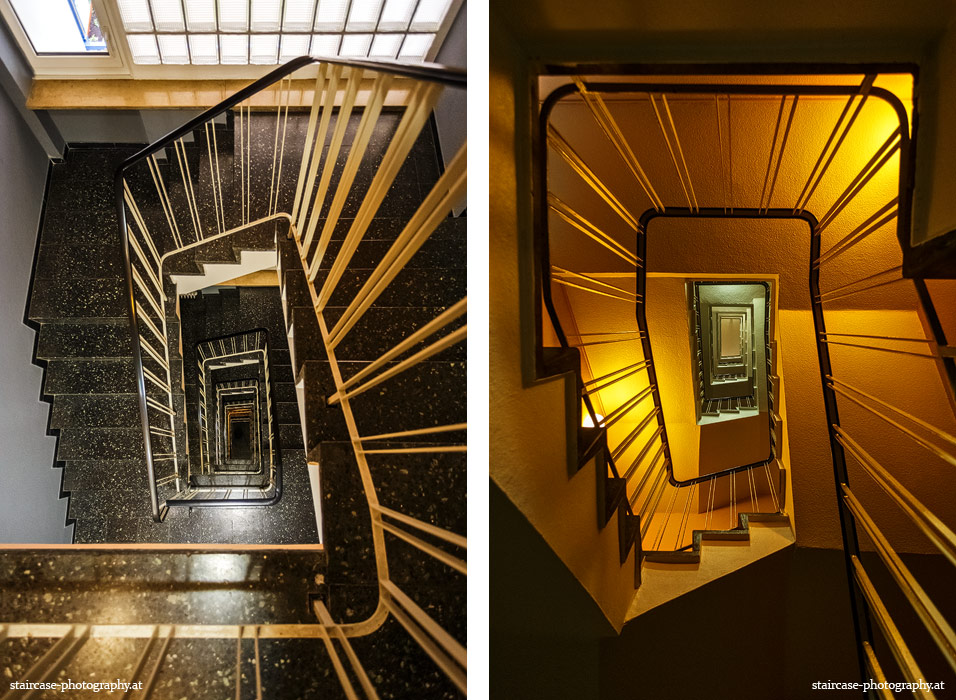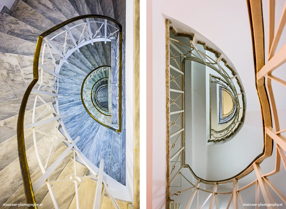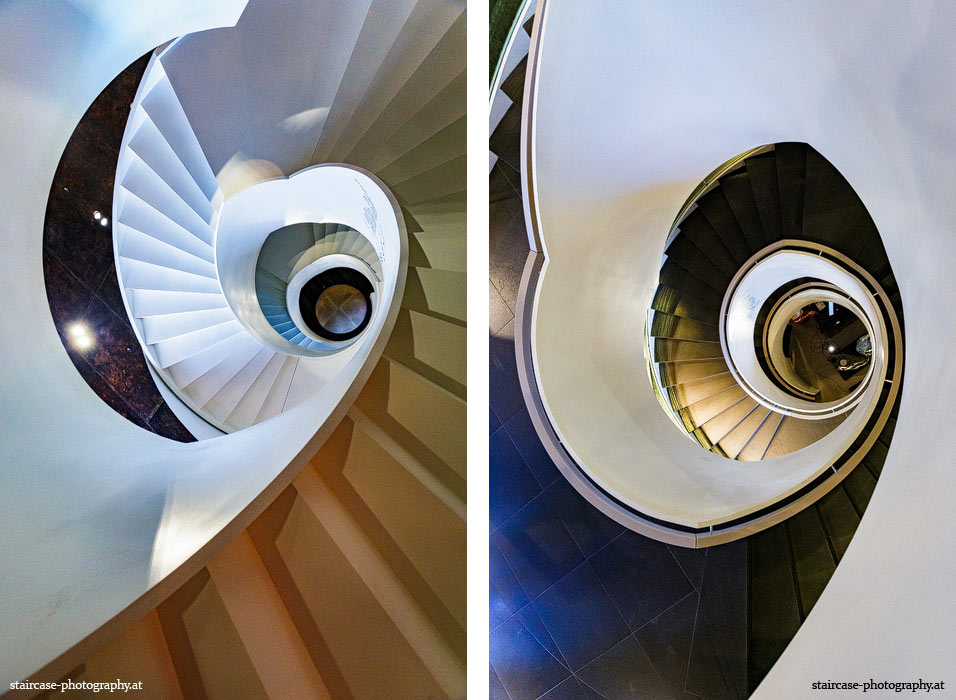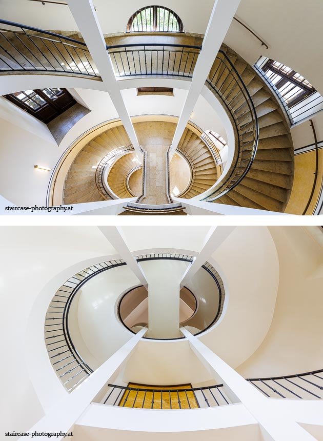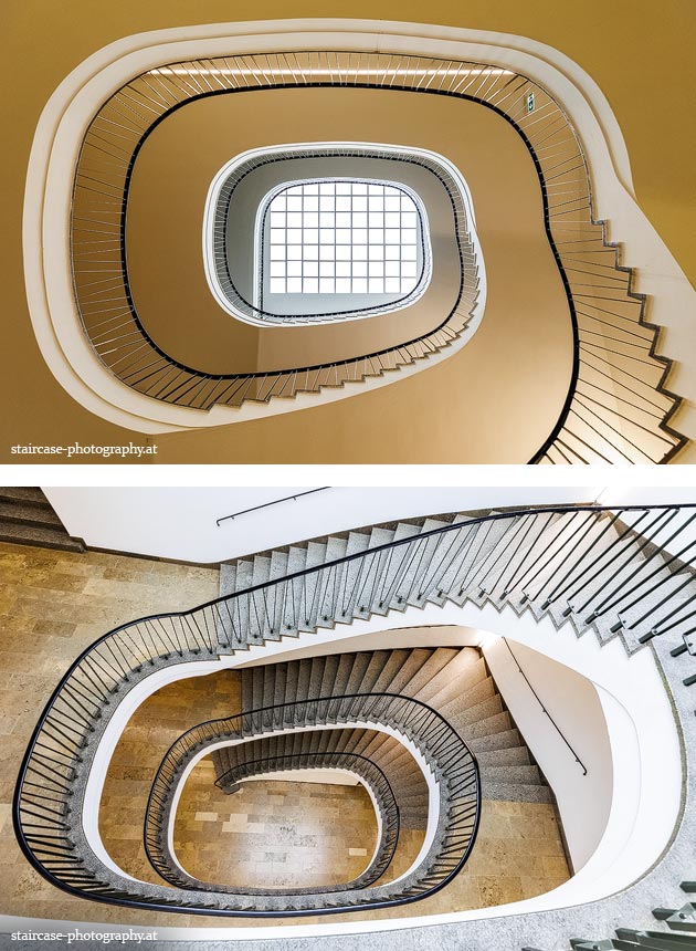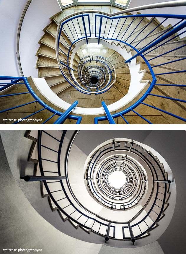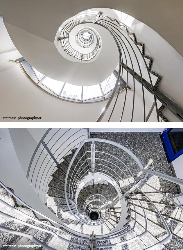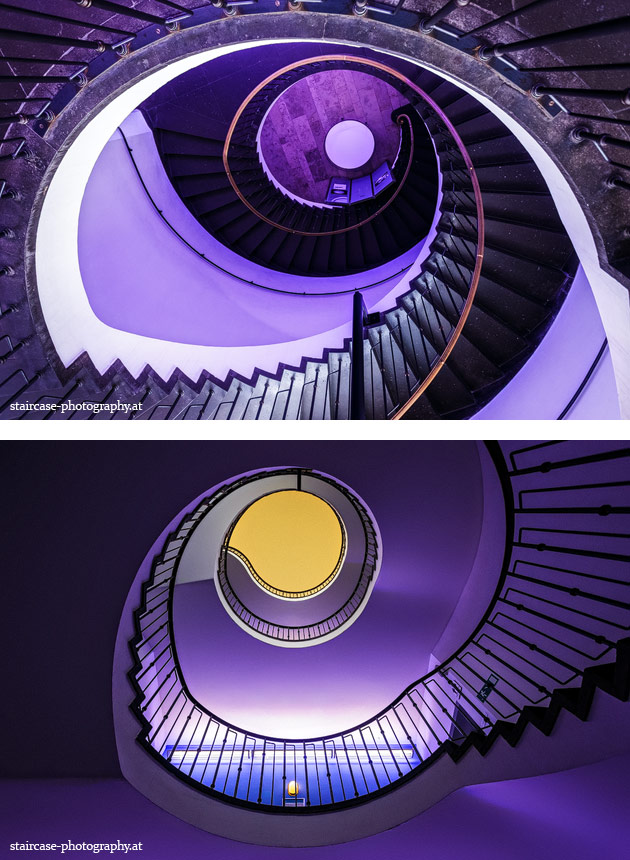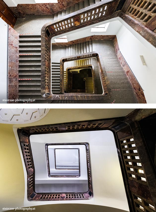 Der Blick von unten nach oben offenbart die Unterseite des Treppenlaufs, das Geländer und an der Spitze ein Deckenmuster. Beim Blick von oben nach unten dagegen bietet sich ein gänzlich anderes Bild, man sieht das Bodenmuster der Treppe, den gefärbten Handlauf und bemerkt eine gänzlich andere Lichtstimmung als zuvor. Einmal präsentiert sich ein und dasselbe Stiegenhaus im Vergleich der Blickwinkel vollkommen anders, ein anderes Mal erkennt man deutlich denselben Charakter von beiden Seiten aus.