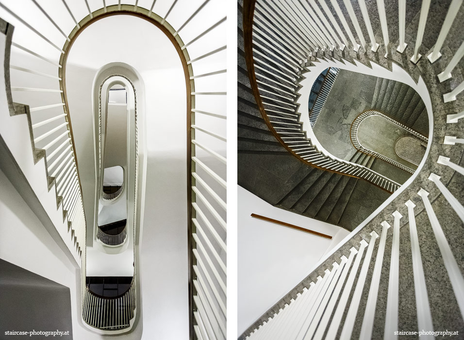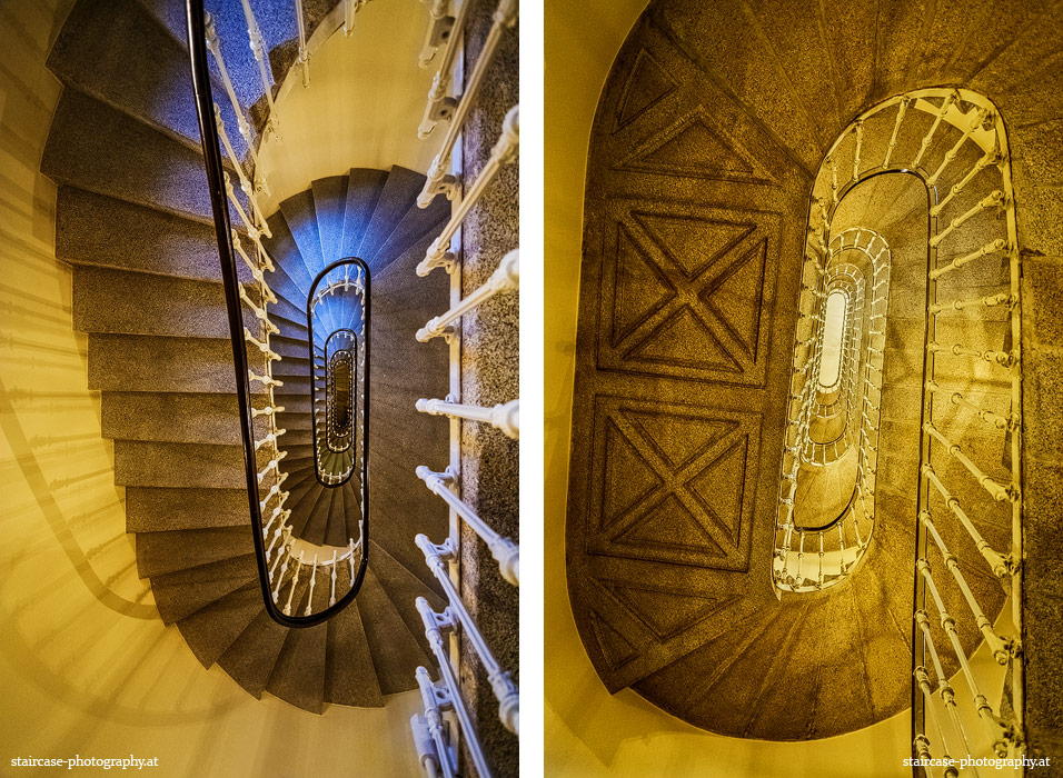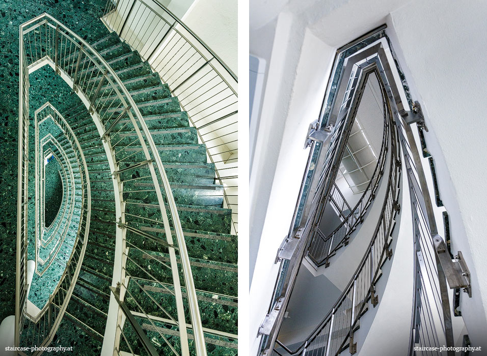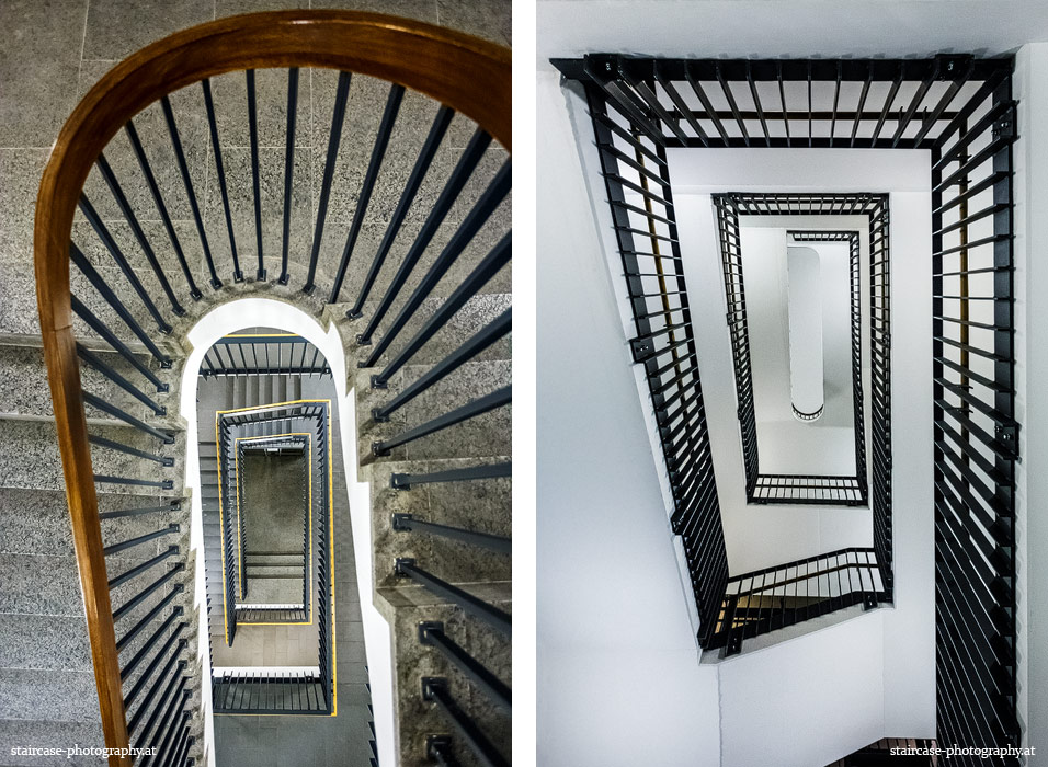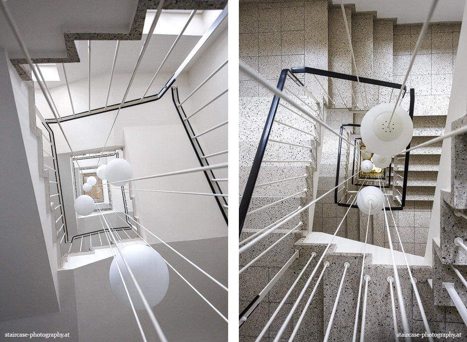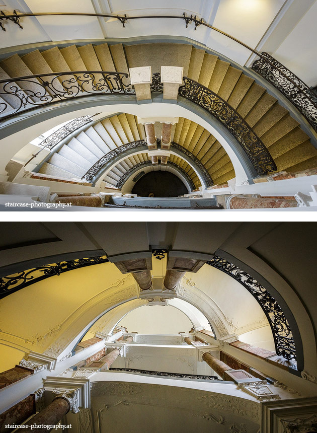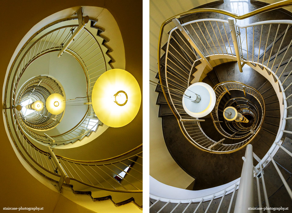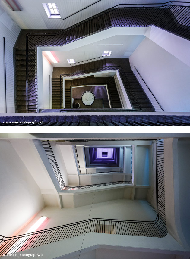 Der Blick von unten nach oben offenbart die Unterseite des Treppenlaufs, das Geländer und an der Spitze ein Deckenmuster. Beim Blick von oben nach unten dagegen bietet sich ein gänzlich anderes Bild, man sieht das Bodenmuster der Treppe, den gefärbten Handlauf und bemerkt eine gänzlich andere Lichtstimmung als zuvor. Einmal präsentiert sich ein und dasselbe Stiegenhaus im Vergleich der Blickwinkel vollkommen anders, ein anderes Mal erkennt man deutlich denselben Charakter von beiden Seiten aus.