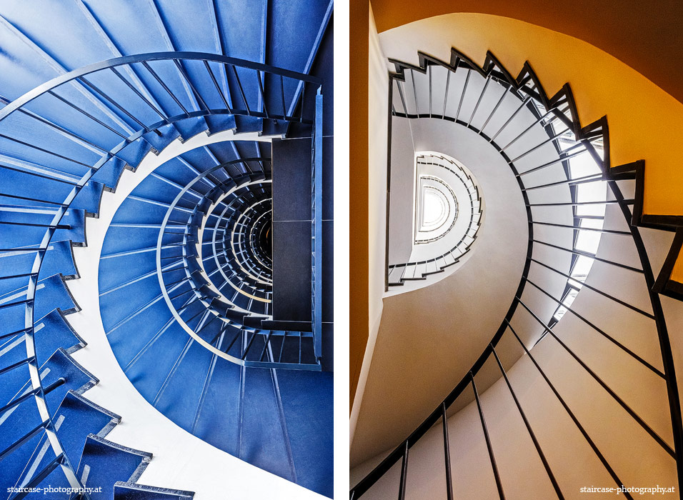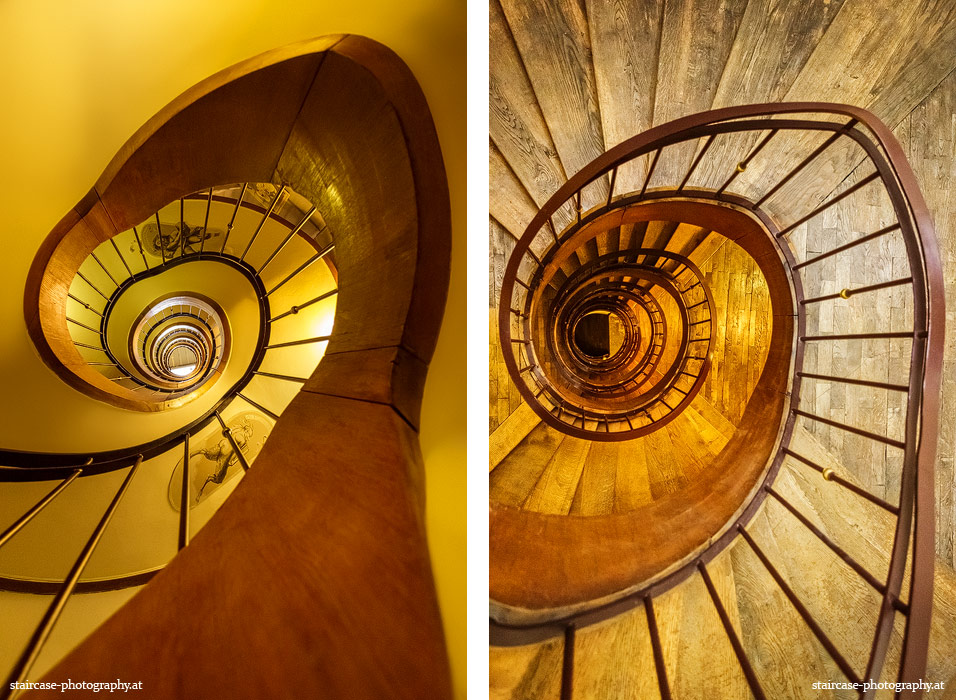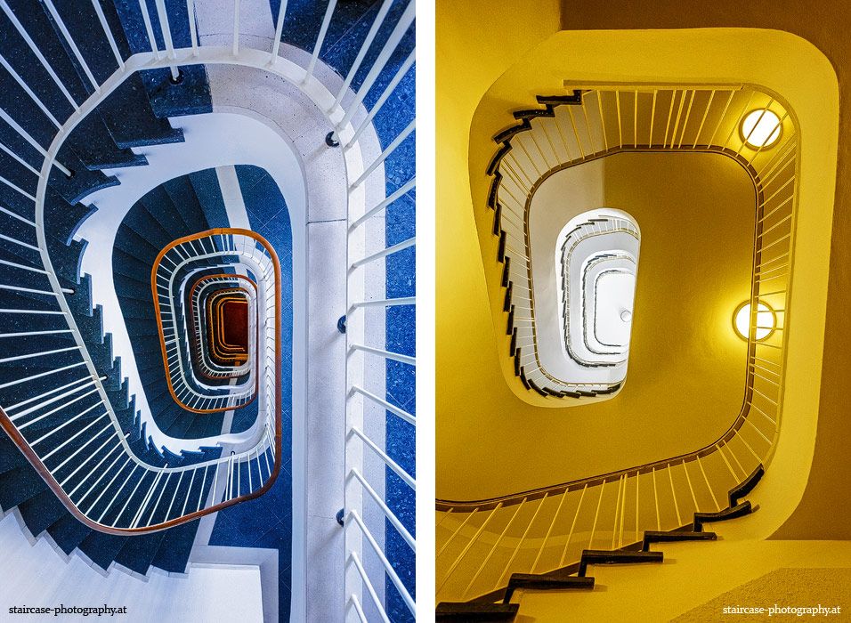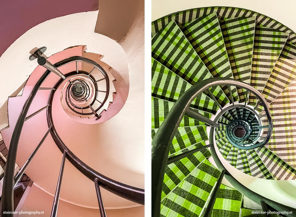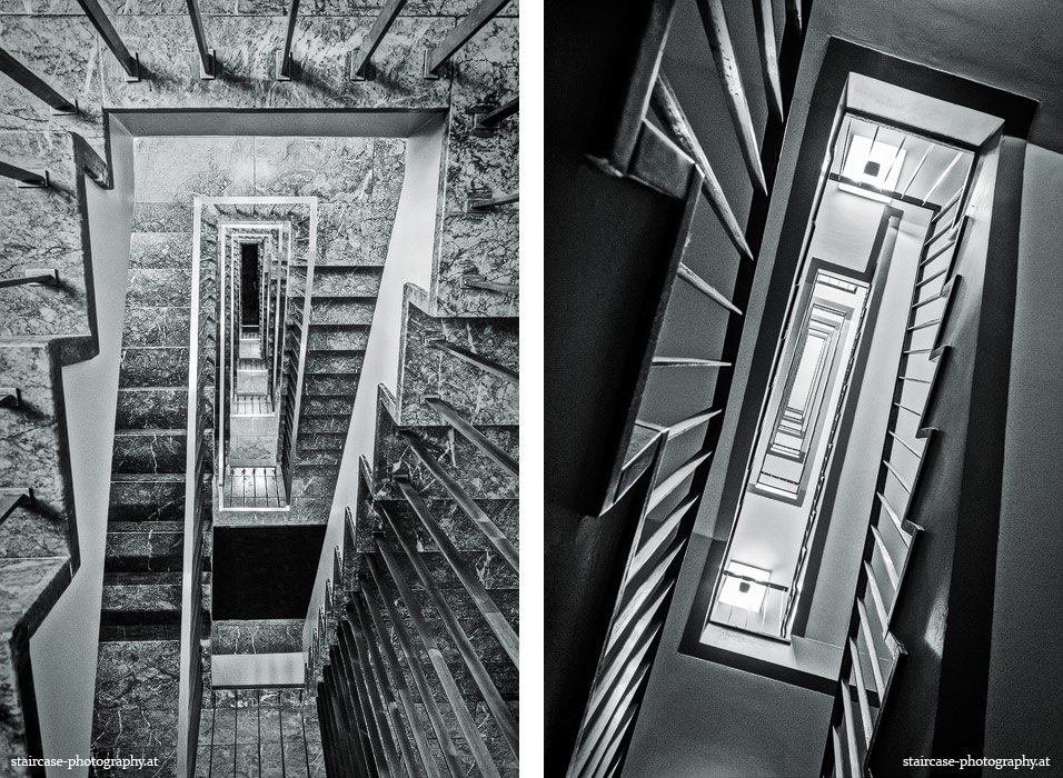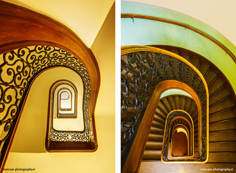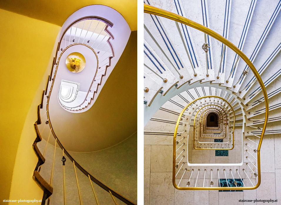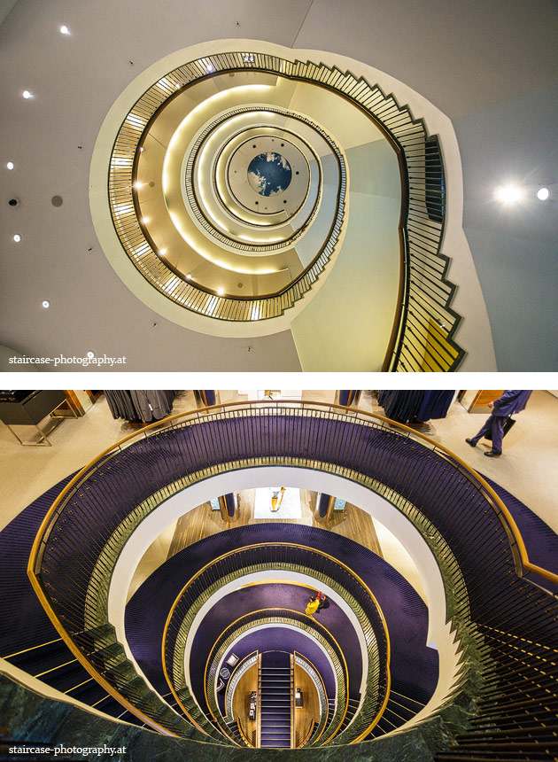 Der Blick von unten nach oben offenbart die Unterseite des Treppenlaufs, das Geländer und an der Spitze ein Deckenmuster. Beim Blick von oben nach unten dagegen bietet sich ein gänzlich anderes Bild, man sieht das Bodenmuster der Treppe, den gefärbten Handlauf und bemerkt eine gänzlich andere Lichtstimmung als zuvor. Einmal präsentiert sich ein und dasselbe Stiegenhaus im Vergleich der Blickwinkel vollkommen anders, ein anderes Mal erkennt man deutlich denselben Charakter von beiden Seiten aus.