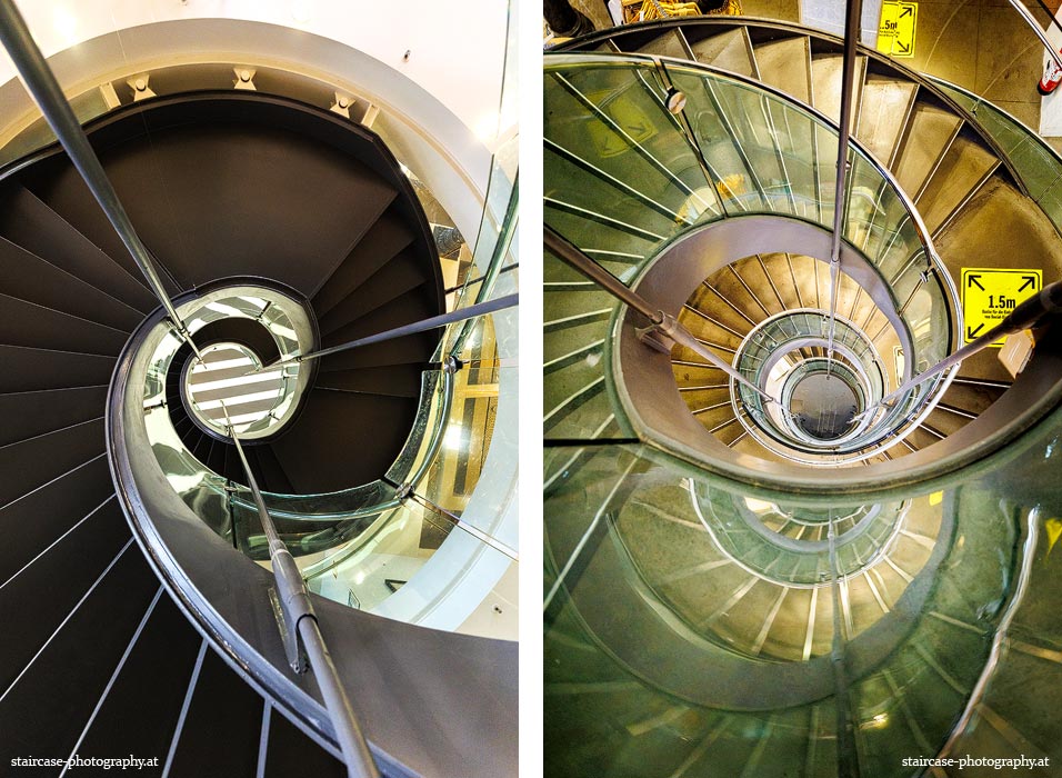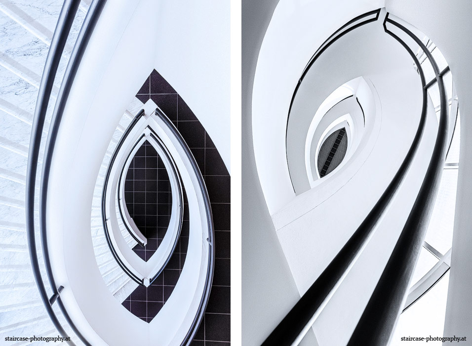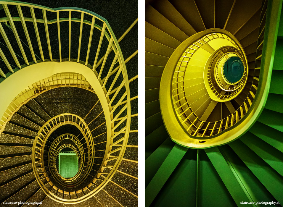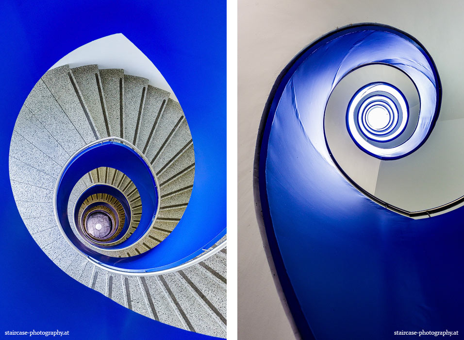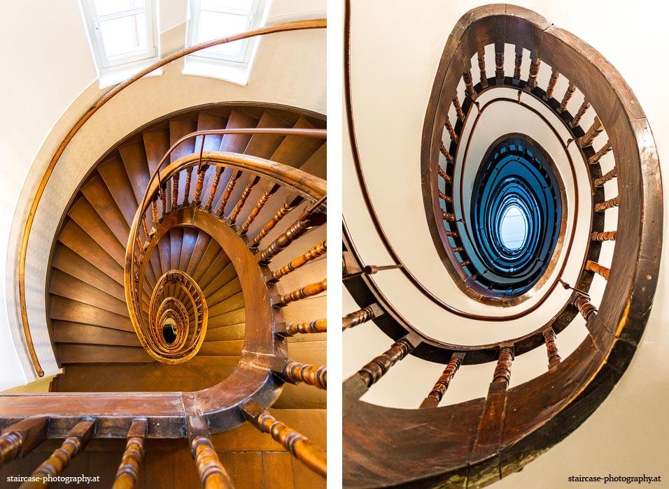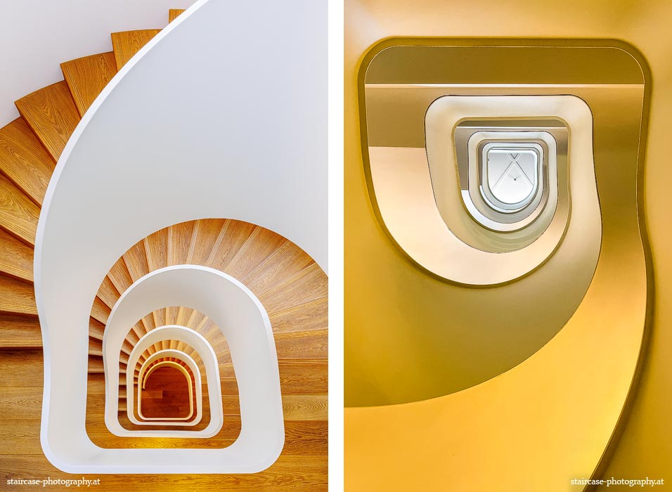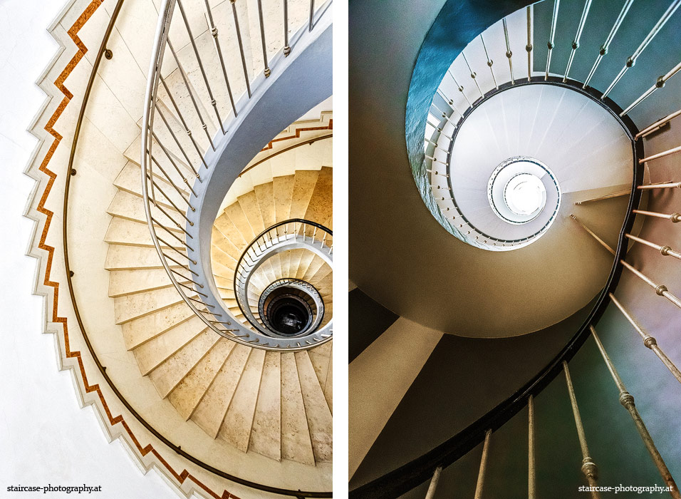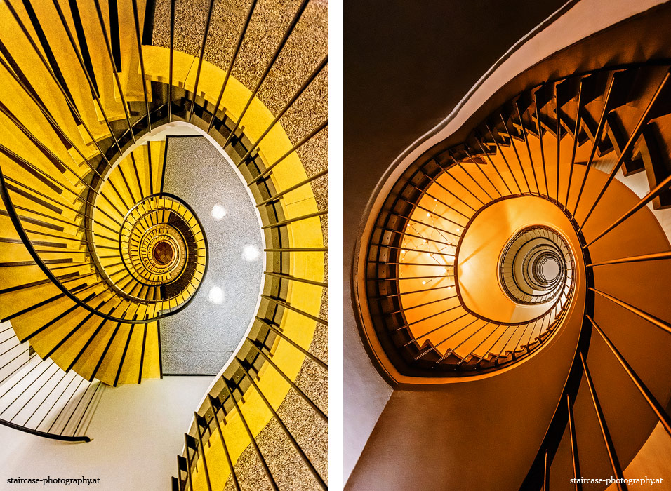 Der Blick von unten nach oben offenbart die Unterseite des Treppenlaufs, das Geländer und an der Spitze ein Deckenmuster. Beim Blick von oben nach unten dagegen bietet sich ein gänzlich anderes Bild, man sieht das Bodenmuster der Treppe, den gefärbten Handlauf und bemerkt eine gänzlich andere Lichtstimmung als zuvor. Einmal präsentiert sich ein und dasselbe Stiegenhaus im Vergleich der Blickwinkel vollkommen anders, ein anderes Mal erkennt man deutlich denselben Charakter von beiden Seiten aus.