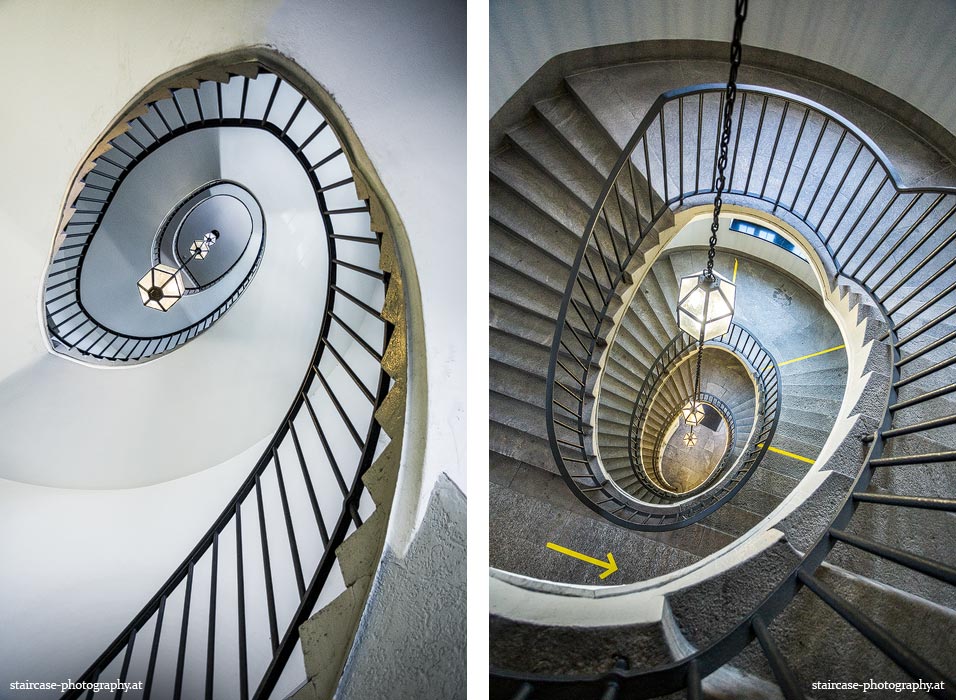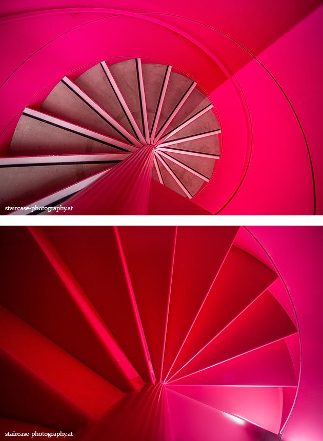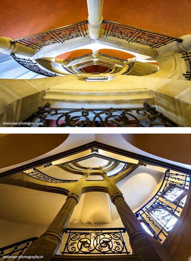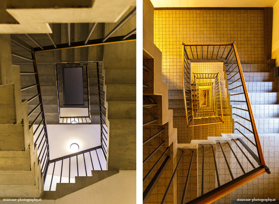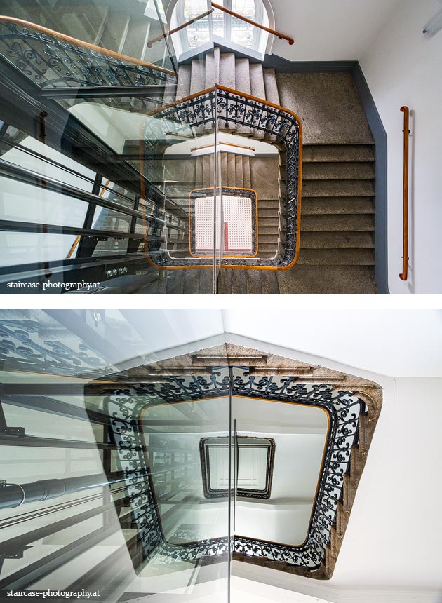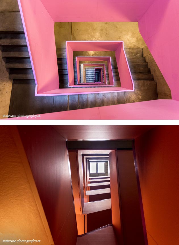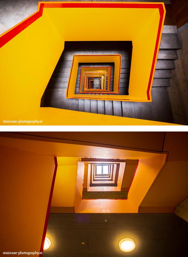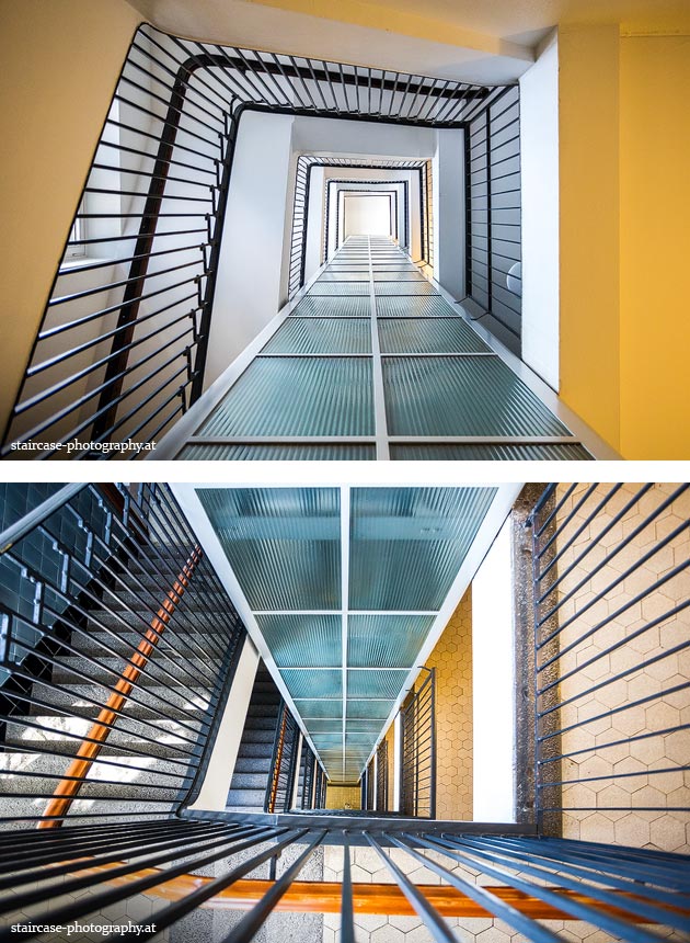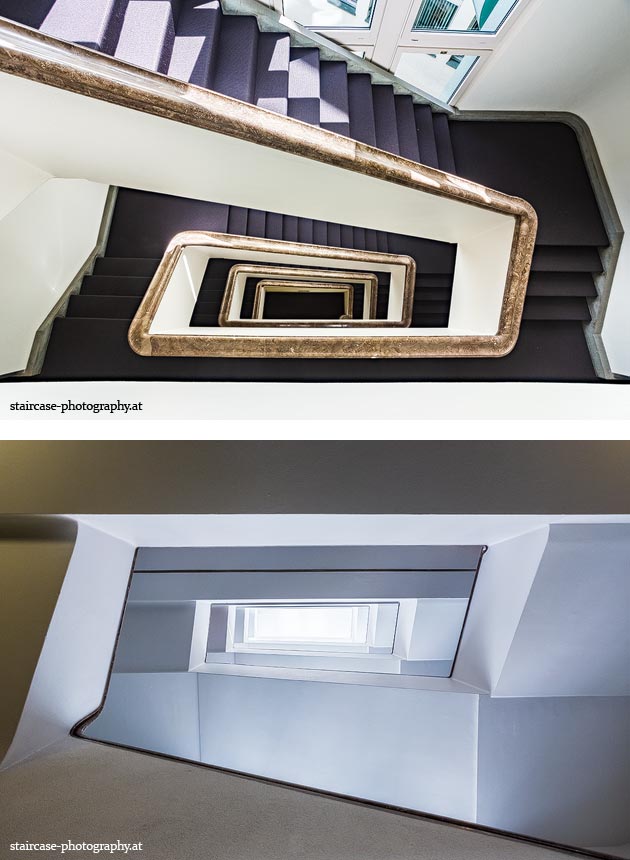 Der Blick von unten nach oben offenbart die Unterseite des Treppenlaufs, das Geländer und an der Spitze ein Deckenmuster. Beim Blick von oben nach unten dagegen bietet sich ein gänzlich anderes Bild, man sieht das Bodenmuster der Treppe, den gefärbten Handlauf und bemerkt eine gänzlich andere Lichtstimmung als zuvor. Einmal präsentiert sich ein und dasselbe Stiegenhaus im Vergleich der Blickwinkel vollkommen anders, ein anderes Mal erkennt man deutlich denselben Charakter von beiden Seiten aus.