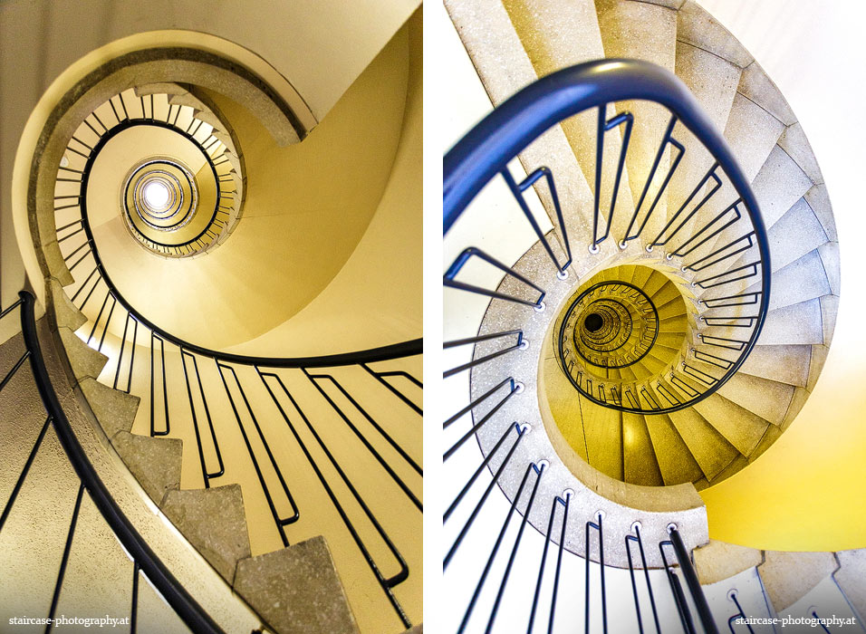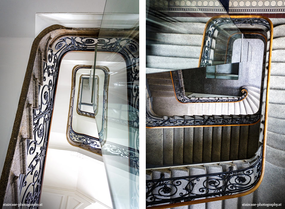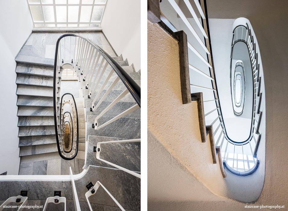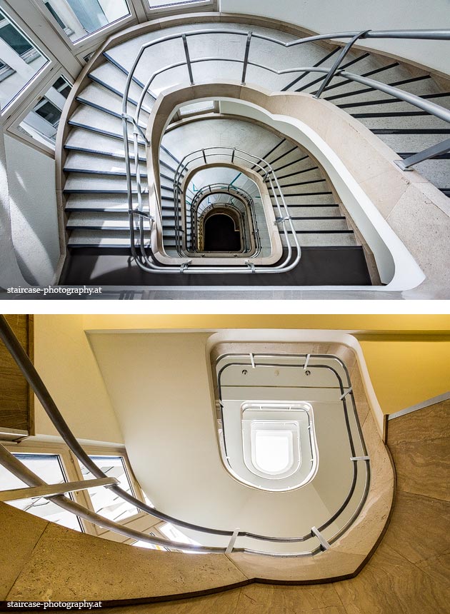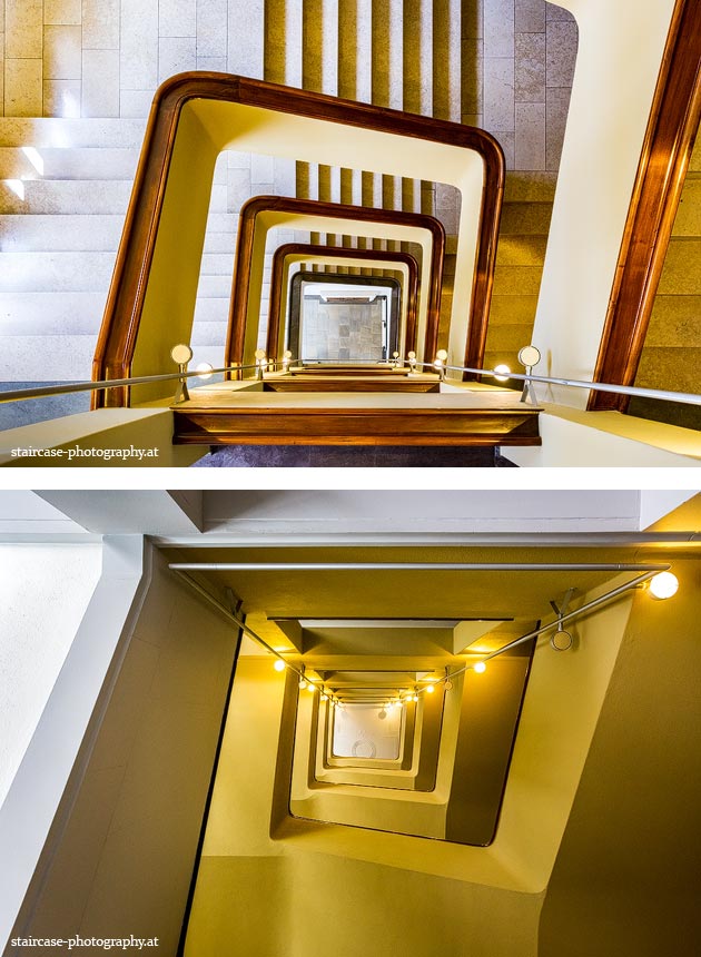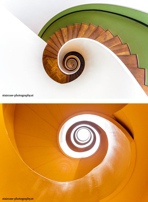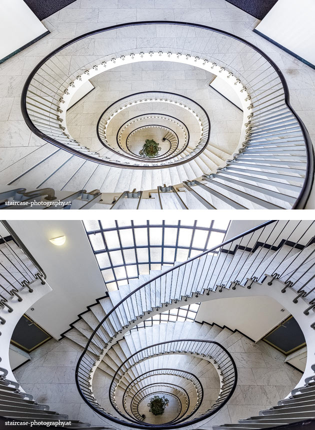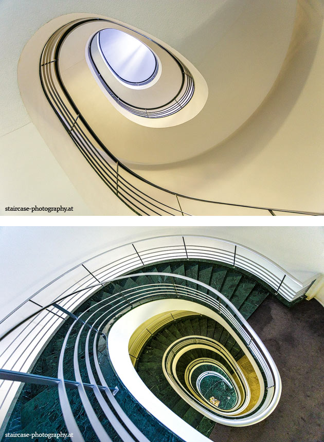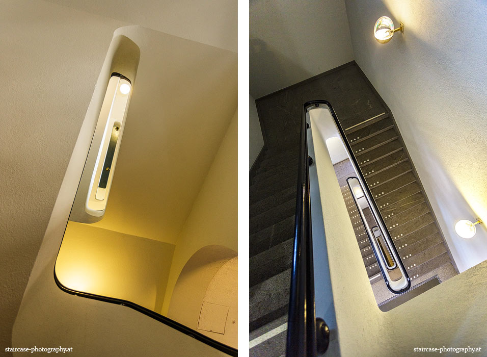 Der Blick von unten nach oben offenbart die Unterseite des Treppenlaufs, das Geländer und an der Spitze ein Deckenmuster. Beim Blick von oben nach unten dagegen bietet sich ein gänzlich anderes Bild, man sieht das Bodenmuster der Treppe, den gefärbten Handlauf und bemerkt eine gänzlich andere Lichtstimmung als zuvor. Einmal präsentiert sich ein und dasselbe Stiegenhaus im Vergleich der Blickwinkel vollkommen anders, ein anderes Mal erkennt man deutlich denselben Charakter von beiden Seiten aus.