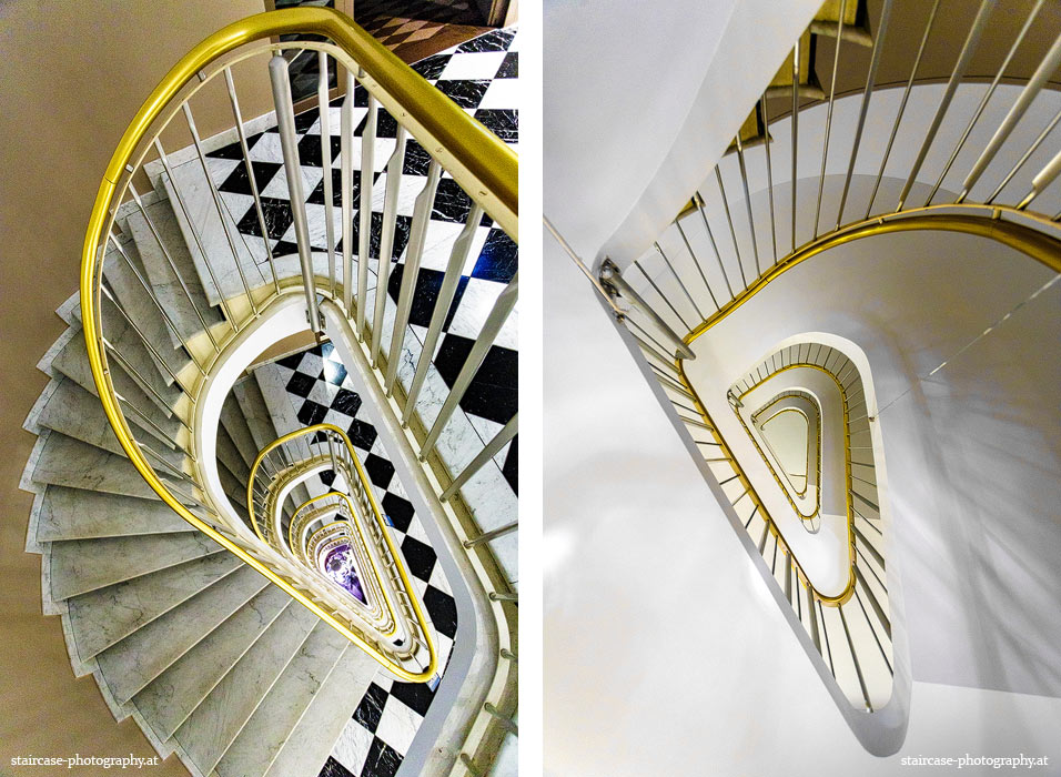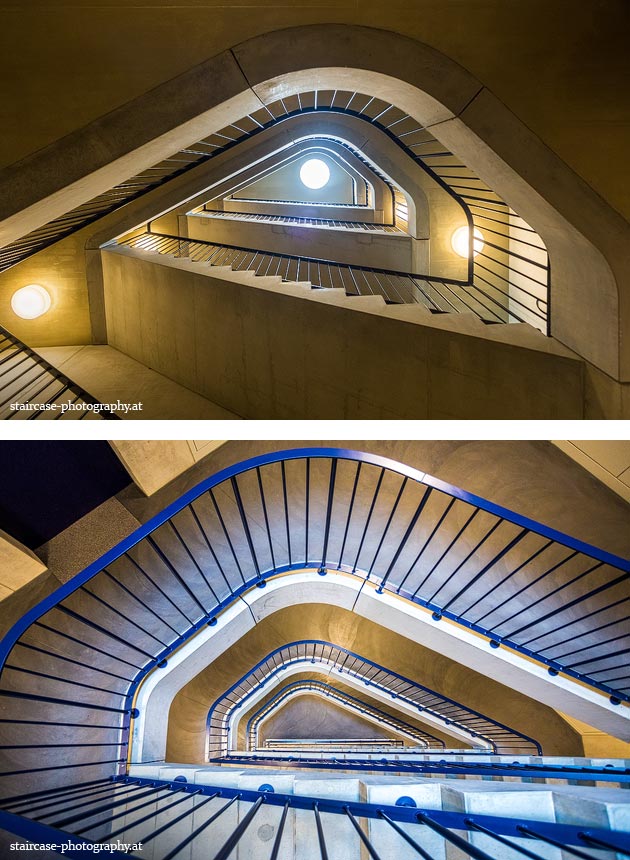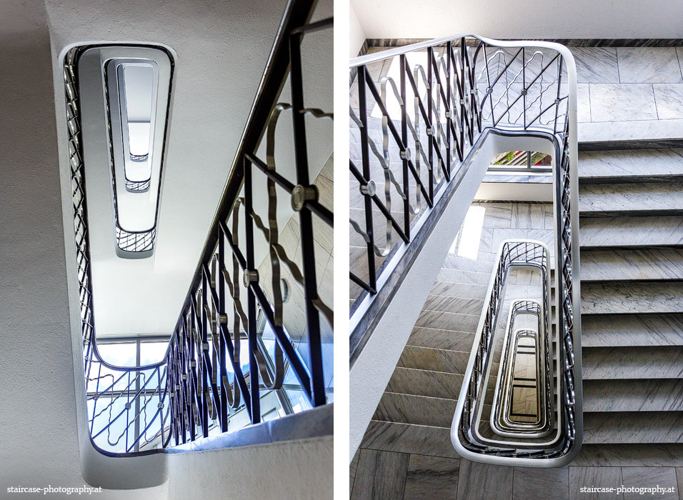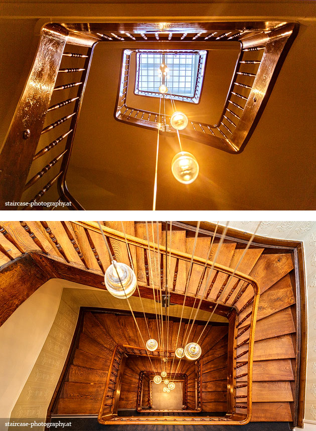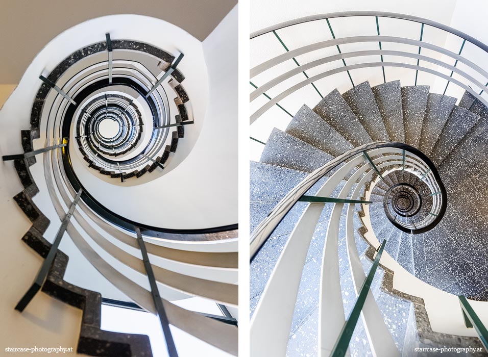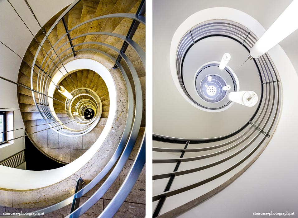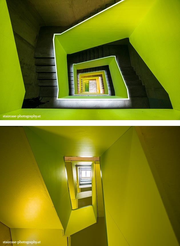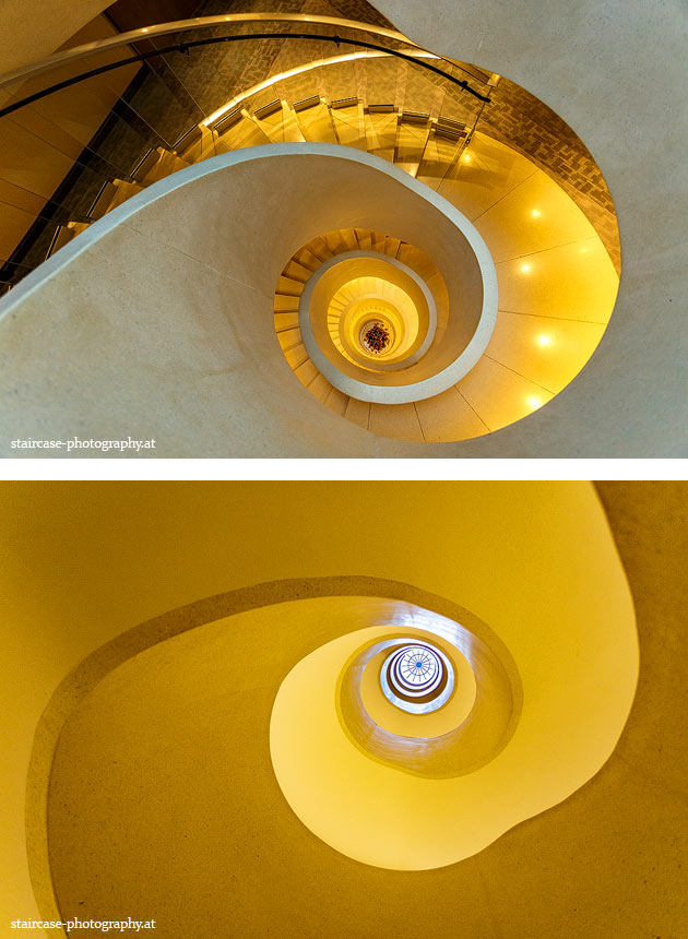 Der Blick von unten nach oben offenbart die Unterseite des Treppenlaufs, das Geländer und an der Spitze ein Deckenmuster. Beim Blick von oben nach unten dagegen bietet sich ein gänzlich anderes Bild, man sieht das Bodenmuster der Treppe, den gefärbten Handlauf und bemerkt eine gänzlich andere Lichtstimmung als zuvor. Einmal präsentiert sich ein und dasselbe Stiegenhaus im Vergleich der Blickwinkel vollkommen anders, ein anderes Mal erkennt man deutlich denselben Charakter von beiden Seiten aus.