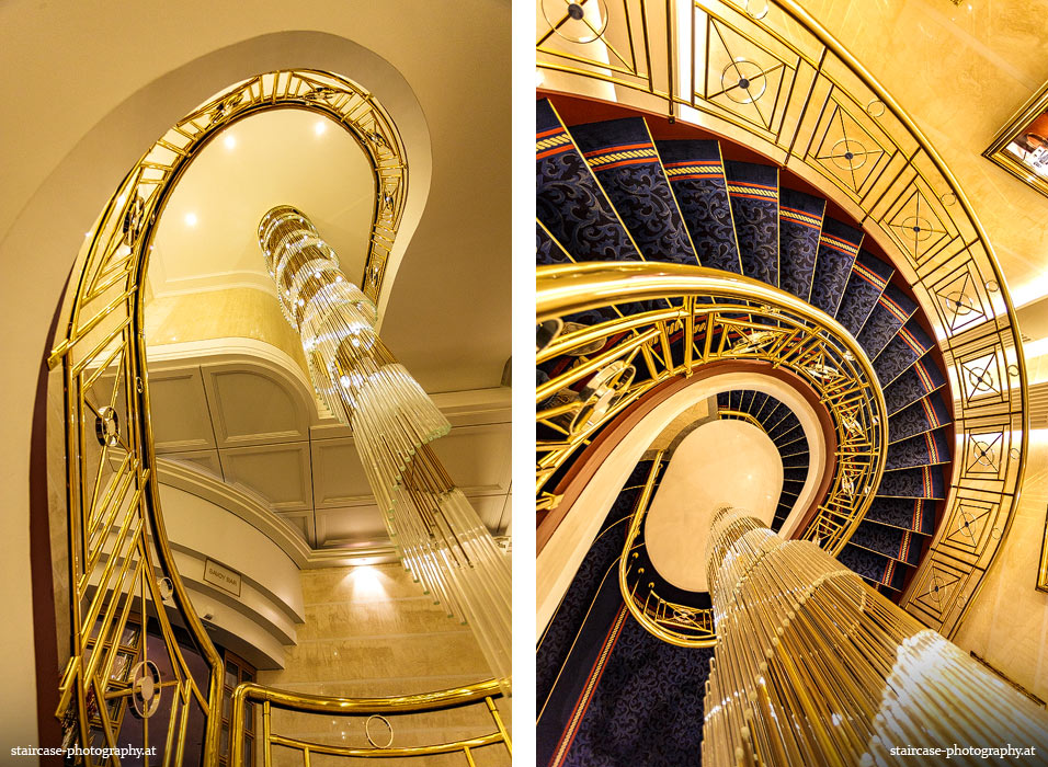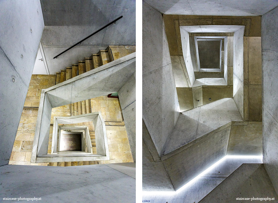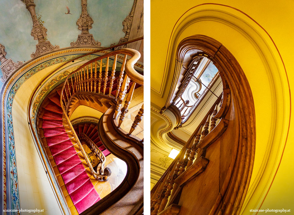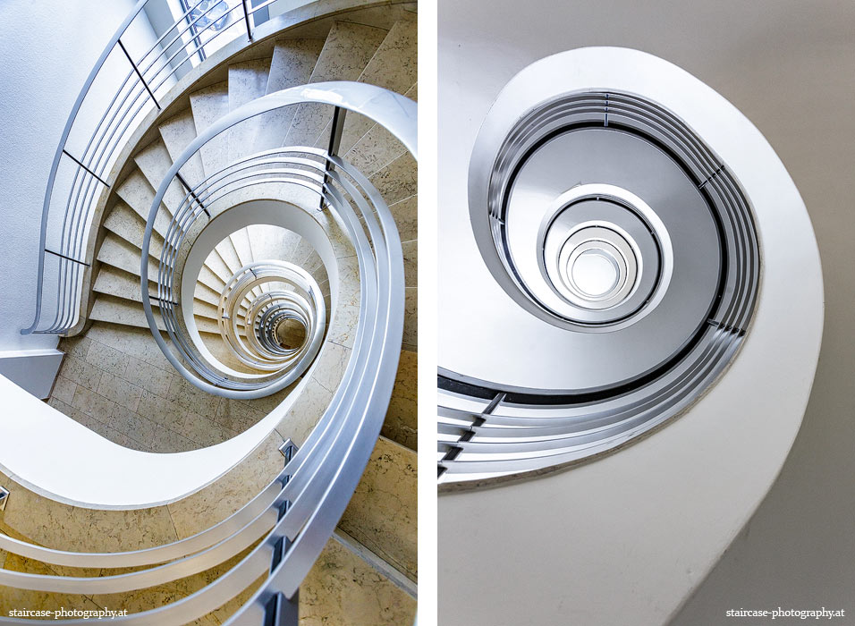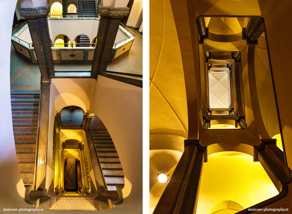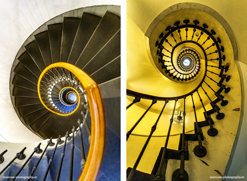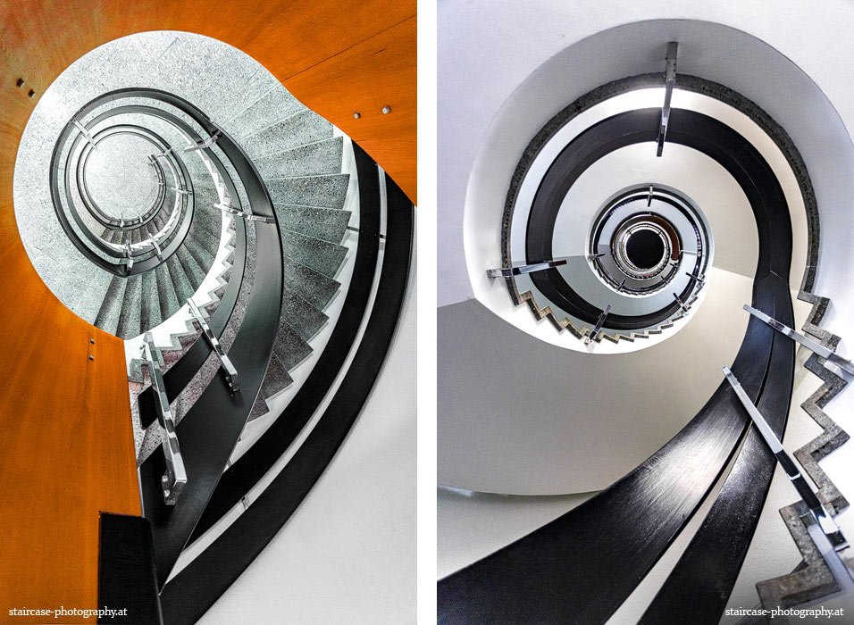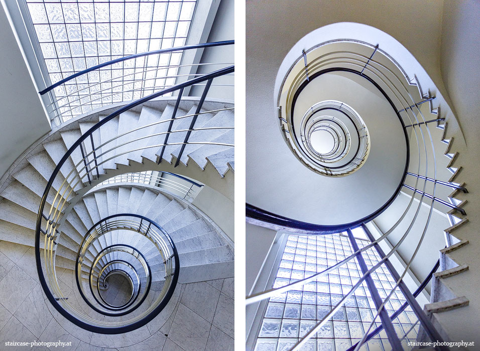 Der Blick von unten nach oben offenbart die Unterseite des Treppenlaufs, das Geländer und an der Spitze ein Deckenmuster. Beim Blick von oben nach unten dagegen bietet sich ein gänzlich anderes Bild, man sieht das Bodenmuster der Treppe, den gefärbten Handlauf und bemerkt eine gänzlich andere Lichtstimmung als zuvor. Einmal präsentiert sich ein und dasselbe Stiegenhaus im Vergleich der Blickwinkel vollkommen anders, ein anderes Mal erkennt man deutlich denselben Charakter von beiden Seiten aus.
